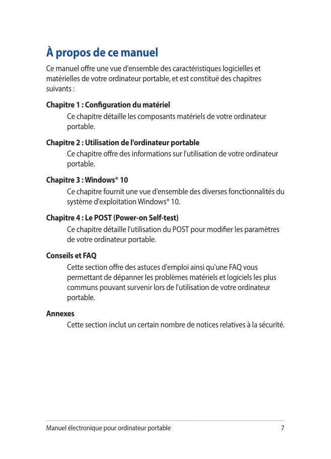 Ce chapitre détaille l'utilisation du POST pour modifier les paramètres de votre ordinateur portable. Conseils et FAQ Cette section offre des astuces d'emploi ainsi qu'une FAQ vous permettant de dépanner les problèmes matériels et logiciels les plus communs pouvant survenir lors de l'utilisation de votre ordinateur portable. Annexes Cette section inclut un certain nombre de notices relatives à la sécurité. Manuel électronique pour ordinateur portable