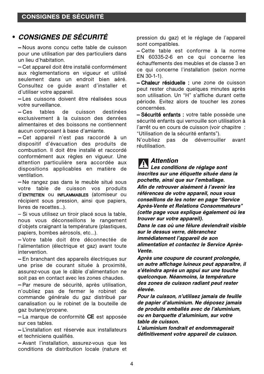 - CONSIGNES DE SÉCURITÉ pression du gaz) et le réglage de l’appareil sont compatibles. — Cette table est conforme à la norme EN 60335-2-6 en ce qui concerne les échauffements des meubles et de classe 3 en ce qui concerne l’installation (selon norme EN 30-1-1). — Chaleur résiduelle : une zone de cuisson peut rester chaude quelques minutes après son utilisation. Un “H” s’affiche durant cette période. Evitez alors de toucher les zones concernées. — Sécurité enfants : votre table possède une sécurité enfants qui verrouille son utilisation à l’arrêt ou en cours de cuisson (voir chapitre : “Utilisation de la sécurité enfants”). N’oubliez pas de déverrouiller avant réutilisation. — Nous avons conçu cette table de cuisson pour une utilisation par des particuliers dans un lieu d’habitation. — Cet appareil doit être installé conformément aux règlementations en vigueur et utilisé seulement dans un endroit bien aéré. Consultez ce guide avant d’installer et d’utiliser votre appareil. — Les cuissons doivent être réalisées sous votre surveillance. — Ces tables de cuisson destinées exclusivement à la cuisson des denrées alimentaires et des boissons ne contiennent aucun composant à base d’amiante. — Cet appareil n’est pas raccordé à un dispositif d’évacuation des produits de combustion. Il doit être installé et raccordé conformément aux règles en vigueur. Une attention particulière sera accordée aux dispositions applicables en matière de ventilation. — Ne rangez pas dans le meuble situé sous votre table de cuisson vos produits d’ENTRETIEN ou INFLAMMABLES (atomiseur ou récipient sous pression, ainsi que papiers, livres de recettes...). — Si vous utilisez un tiroir placé sous la table, nous vous déconseillons le rangement d’objets craignant la température (plastiques, papiers, bombes aérosols, etc...). — Votre table doit être déconnectée de l’alimentation (électrique et gaz) avant toute intervention. — En branchant des appareils électriques sur une prise de courant située à proximité, assurez-vous que le câble d’alimentation ne soit pas en contact avec les zones chaudes. — Par mesure de sécurité, après utilisation, n’oubliez pas de fermer le robinet de commande générale du gaz distribué par canalisation ou le robinet de la bouteille de gaz butane/propane. — La marque de conformité CE est apposée sur ces tables. — L’installation est réservée aux installateurs et techniciens qualifiés. — Avant l’installation, assurez-vous que les conditions de distribution locale (nature et Attention Les conditions de réglage sont inscrites sur une étiquette située dans la pochette, ainsi que sur l’emballage. Afin de retrouver aisément à l’avenir les références de votre appareil, nous vous conseillons de les noter en page “Service Après-Vente et Relations Consommateurs” (cette page vous explique également où les trouver sur votre appareil). Dans le cas où une fêlure deviendrait visible sur le dessus verre, débranchez immédiatement l’appareil de son alimentation et contactez le Service AprèsVente. Après une coupure de courant prolongée, un autre affichage luineux peut apparaître, il s’éteindra après un appui sur une touche quelconque. Néanmoins, la température des zones de cuisson radiant peut rester élevée. Pour la cuisson, n’utilisez jamais de feuille de papier d’aluminium. Ne déposez jamais de produits emballés avec de l’aluminium, ou en barquette d’aluminium, sur votre table de cuisson. L’aluminium fondrait et endommagerait définitivement votre appareil de cuisson.