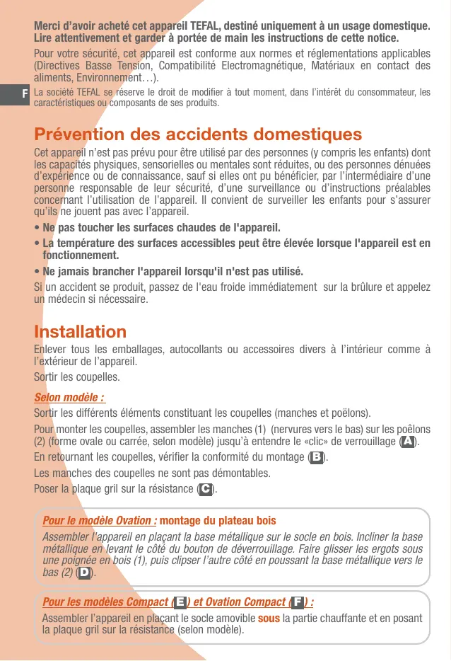 A B C D E F G H J K L M N P Q R S T U V W X Z Y Merci d’avoir acheté cet appareil TEFAL, destiné uniquement à un usage domestique. Lire attentivement et garder à portée de main les instructions de cette notice. Pour votre sécurité, cet appareil est conforme aux normes et réglementations applicables (Directives Basse Tension, Compatibilité Electromagnétique, Matériaux en contact des aliments, Environnement…). F La société TEFAL se réserve le droit de modifier à tout moment, dans l’intérêt du consommateur, les caractéristiques ou composants de ses produits.