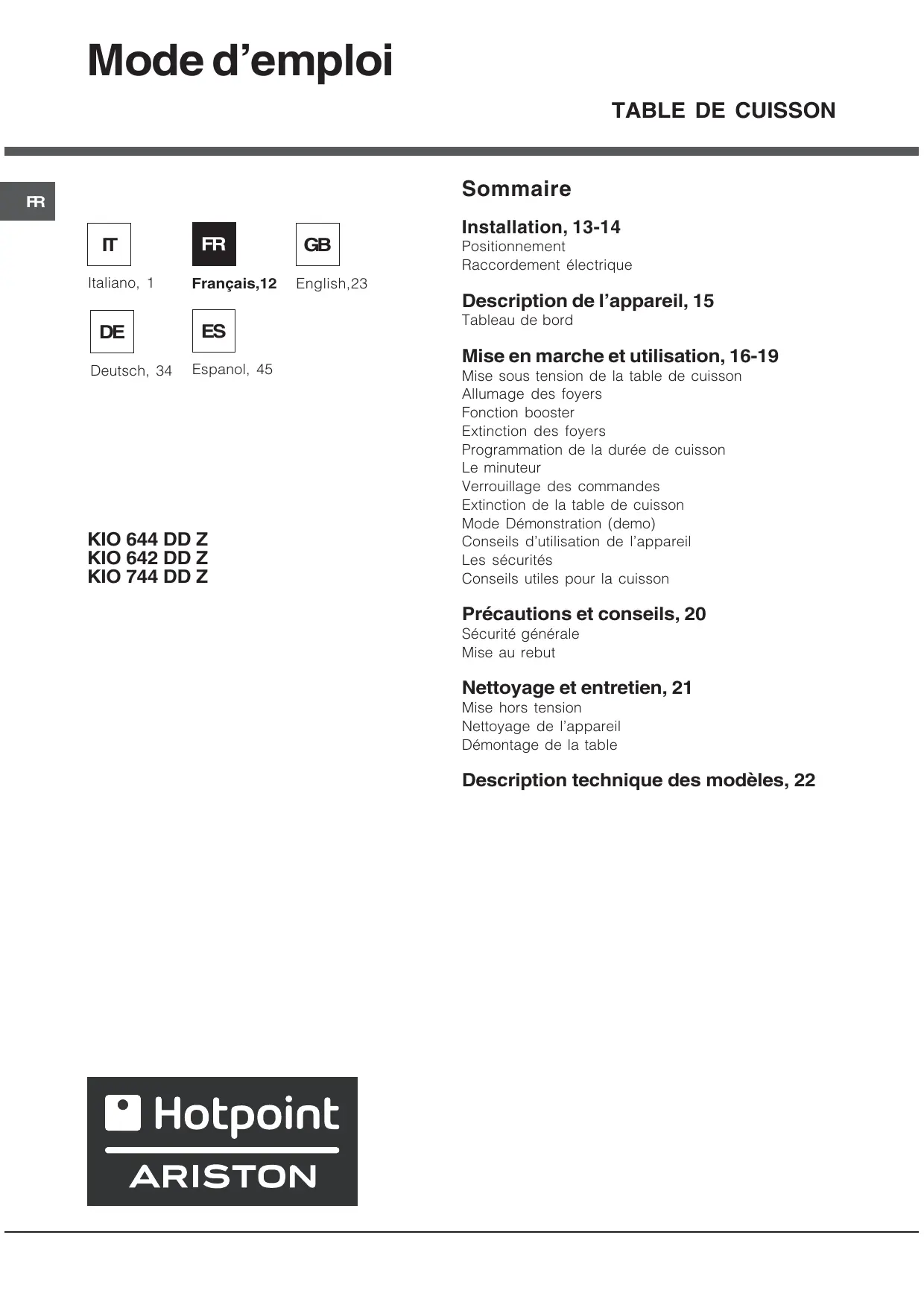 KIO 644 DD Z - Table de cuisson HOTPOINT - Notice d'utilisation et mode d'emploi gratuit