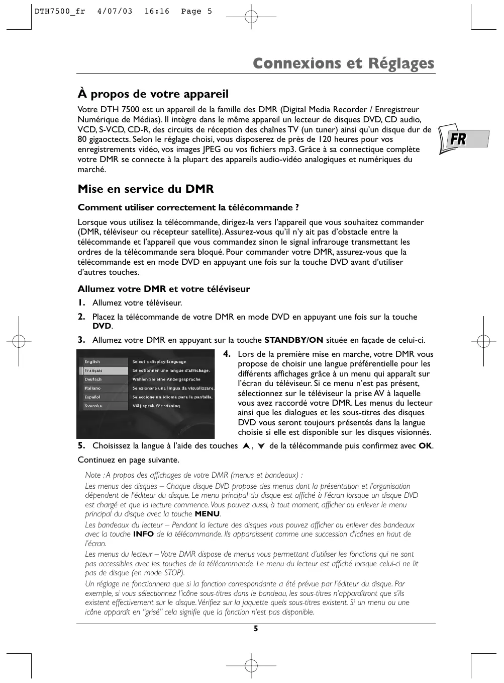 - La langue préférentielle pour les dialogues et les sous-titres des disques DVD a été choisie lors de la première installation de votre DMR. Pour la changer reportez-vous en pages 44 et 45.