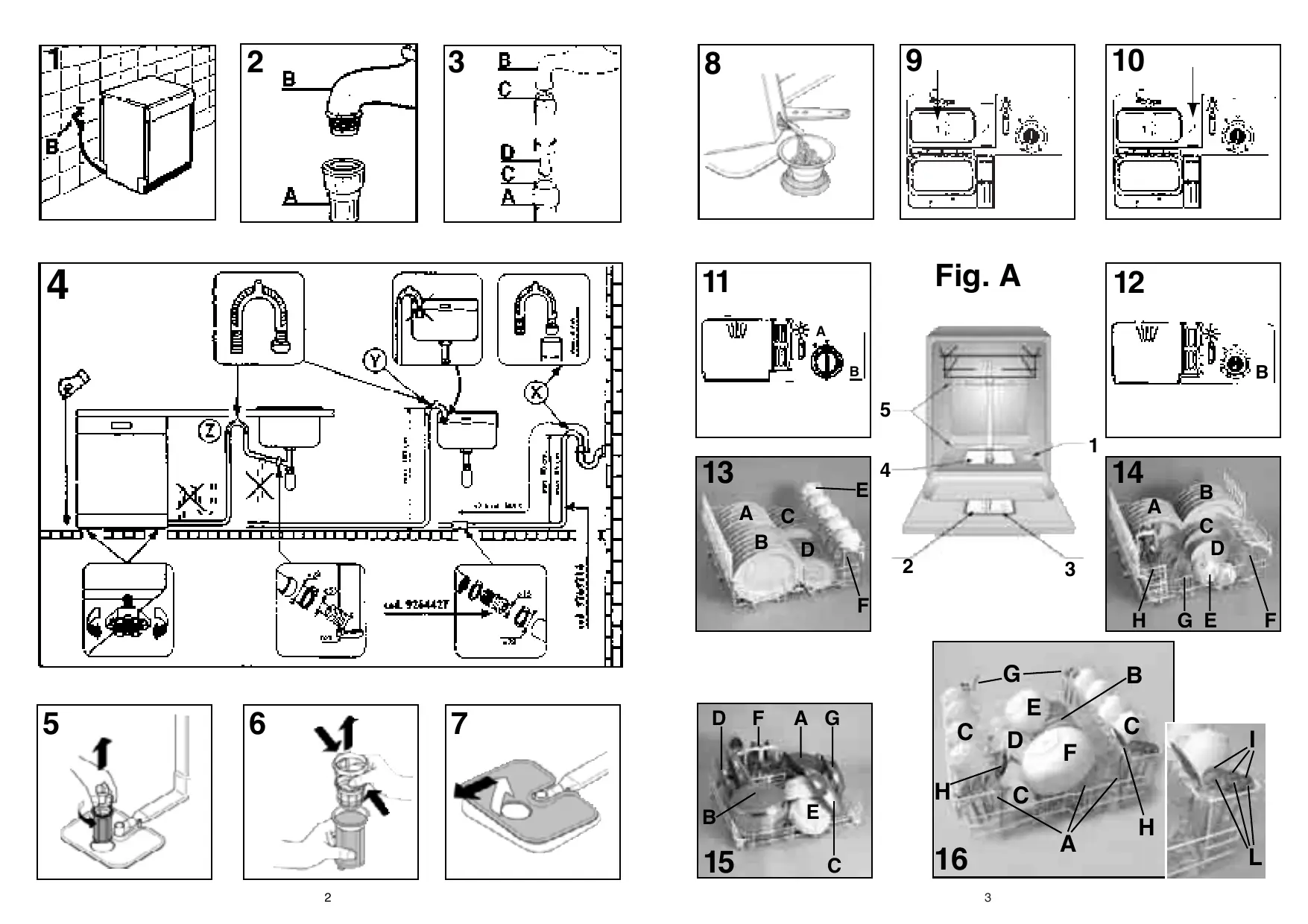 En cas d'installation sous un dessus continu, le coude doit être fixé immédiatement sous le dessus au point le plus haut possible (fig. 4z). Pendant l'installation de la machine, contrôler que les tubes de remplissage et de vidange ne sont pas pliés.