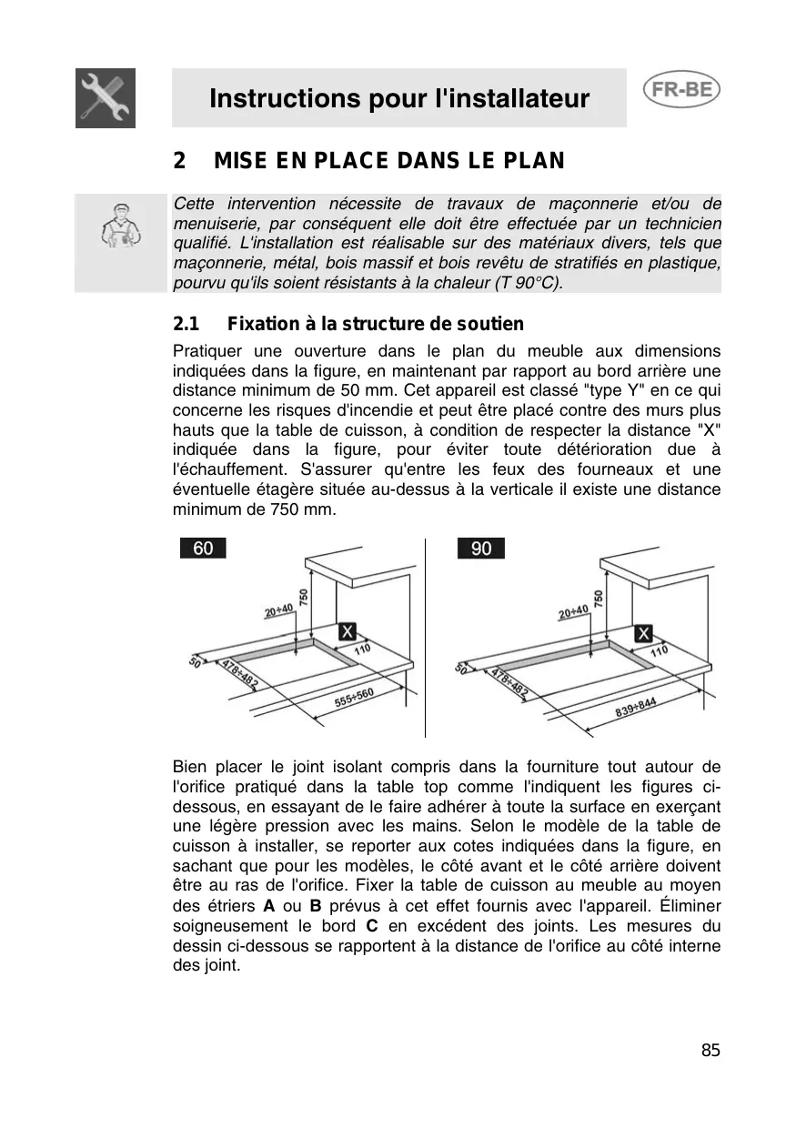Fixation à la structure de soutien Pratiquer une ouverture dans le plan du meuble aux dimensions indiquées dans la figure, en maintenant par rapport au bord arrière une distance minimum de 50 mm. Cet appareil est classé "type Y" en ce qui concerne les risques d'incendie et peut être placé contre des murs plus hauts que la table de cuisson, à condition de respecter la distance "X" indiquée dans la figure, pour éviter toute détérioration due à l'échauffement. S'assurer qu'entre les feux des fourneaux et une éventuelle étagère située au-dessus à la verticale il existe une distance minimum de 750 mm. Bien placer le joint isolant compris dans la fourniture tout autour de l'orifice pratiqué dans la table top comme l'indiquent les figures cidessous, en essayant de le faire adhérer à toute la surface en exerçant une légère pression avec les mains. Selon le modèle de la table de cuisson à installer, se reporter aux cotes indiquées dans la figure, en sachant que pour les modèles, le côté avant et le côté arrière doivent être au ras de l'orifice. Fixer la table de cuisson au meuble au moyen des étriers A ou B prévus à cet effet fournis avec l'appareil. Éliminer soigneusement le bord C en excédent des joints. Les mesures du dessin ci-dessous se rapportent à la distance de l'orifice au côté interne des joint.