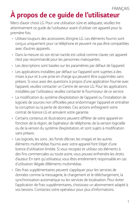Merci d’avoir choisi LG. Pour une utilisation sûre et adéquate, veuillez lire attentivement ce guide de l’utilisateur avant d’utiliser cet appareil pour la première fois. • Utilisez toujours des accessoires d’origine LG. Les éléments fournis sont conçus uniquement pour ce téléphone et peuvent ne pas être compatibles avec d’autres appareils. • Dans la mesure où son écran tactile est utilisé comme clavier, cet appareil n’est pas recommandé pour les personnes malvoyantes. • Les descriptions sont basées sur les paramètres par défaut de l’appareil. • Les applications installées par défaut sur l’appareil sont sujettes à des mises à jour et à une prise en charge qui peuvent être supprimées sans préavis. Si vous avez des questions à propos d’une application fournie avec l’appareil, veuillez contacter un Centre de service LG. Pour les applications installées par l’utilisateur, veuillez contacter le fournisseur de ce service. • La modification du système d’exploitation de l’appareil ou l’installation de logiciels de sources non officielles peut endommager l’appareil et entraîner la corruption ou la perte de données. Ces actions enfreignent votre contrat de licence LG et annulent votre garantie. • Certains contenus et illustrations peuvent différer de votre appareil en fonction de la région, de l’opérateur de téléphonie, de la version logicielle ou de la version du système d’exploitation, et sont sujets à modification sans préavis. • Les logiciels, les sons , les fonds d’écran, les images et les autres éléments multimédias fournis avec votre appareil font l’objet d’une licence d’utilisation limitée. Si vous recopiez et utilisez ces éléments à des fins commerciales ou toute autre, vous pouvez enfreindre les droits d’auteur. En tant qu’utilisateur, vous êtes entièrement responsable en cas d’utilisation illégale d’éléments multimédias. • Des frais supplémentaires peuvent s’appliquer pour les services de données comme la messagerie, le chargement et le téléchargement, la synchronisation automatique ou les services de localisation. Pour éviter l’application de frais supplémentaires, choisissez un abonnement adapté à vos besoins. Contactez votre opérateur pour plus d’informations. 1