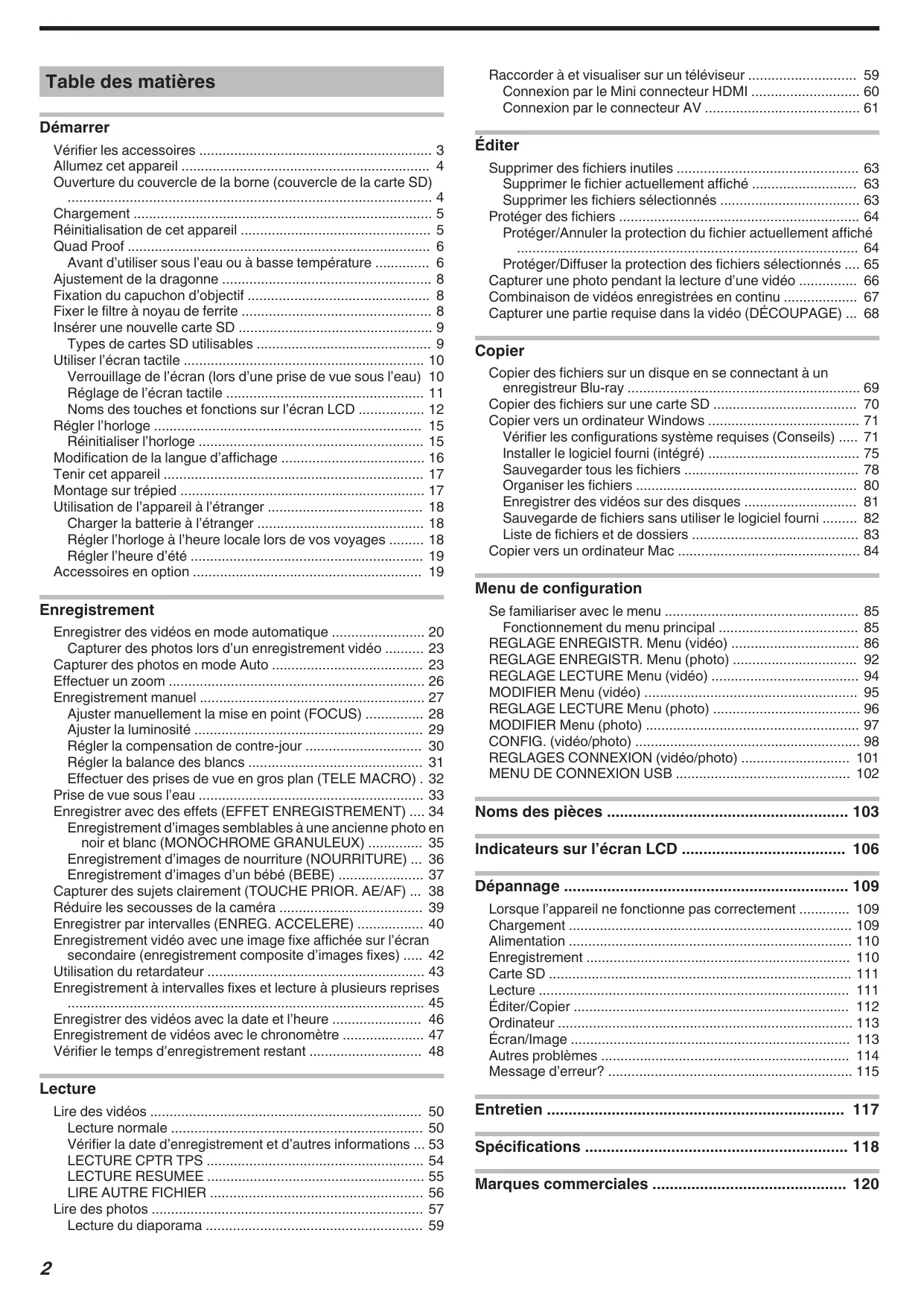 Dépannage Carte SD Lecture Impossible d’insérer la carte SD. Le son ou la vidéo est interrompu(e). Assurez-vous de ne pas insérer la carte SD dans le mauvais sens. “Insérer une nouvelle carte SD” (A p. 9) N’utilisez pas une carte miniSD ou microSD sur cet appareil (même si la carte est insérée dans un adaptateur). Cela pourrait provoquer un dysfonctionnement. “Types de cartes SD utilisables” (A p. 9) La lecture est parfois interrompue aux sections reliant deux scènes. Ce n’est pas un dysfonctionnement. Impossible de copier vers une carte SD. Règle “SUPPORT ENREG. VIDEO”/“SUPPORT ENREG. PHOTO” sur la carte SD. “ SUPPORT ENREG. VIDEO ” (A p. 99) “ SUPPORT ENREG. PHOTO ” (A p. 100) Pour utiliser une nouvelle carte SD, ou une carte SD utilisée sur d’autres appareils, il est nécessaire de formater (initialiser) la carte SD en utilisant “FORMATER LA CARTE SD” à partir du menu “CONFIG.”. “ FORMATER LA CARTE SD ” (A p. 100) Lorsque “VERIFIER LOQUET DE PROTECTION CARTE” s’affiche, relâchez le verrouillage sur la carte SD. Aucun son. Lorsque le mode silencieux est utilisé, les sons de fonctionnement ne sont pas produits. Éteignez le mode Silencieux. “Utiliser le mode Silencieux” (A p. 22) Le son audio n’est pas enregistré pour les vidéos prises en ENREG. ACCELERE. “Enregistrer par intervalles (ENREG. ACCELERE)” (A p. 40) La même image est affichée pour une longue période de temps. Utilise une carte SD à haute vitesse (Classe 4 ou supérieure). “Types de cartes SD utilisables” (A p. 9) Nettoyez les bornes de la carte SD avec un coton tige sec ou quelque chose de similaire. Exécutez “FORMATER LA CARTE SD” dans le menu “CONFIG.”. (Toutes les données seront supprimées.) “ FORMATER LA CARTE SD ” (A p. 100) Le mouvement est saccadé. Utilise une carte SD à haute vitesse (Classe 4 ou supérieure). “Types de cartes SD utilisables” (A p. 9) Nettoyez les bornes de la carte SD avec un coton tige sec ou quelque chose de similaire. Exécutez “FORMATER LA CARTE SD” dans le menu “CONFIG.”. (Toutes les données seront supprimées.) “ FORMATER LA CARTE SD ” (A p. 100) Verifiez les configurations système de votre PC lorsque vous utilisez Everio MediaBrowser 4 pour la lecture. “Vérifier les configurations système requises (Conseils)” (A p. 71)