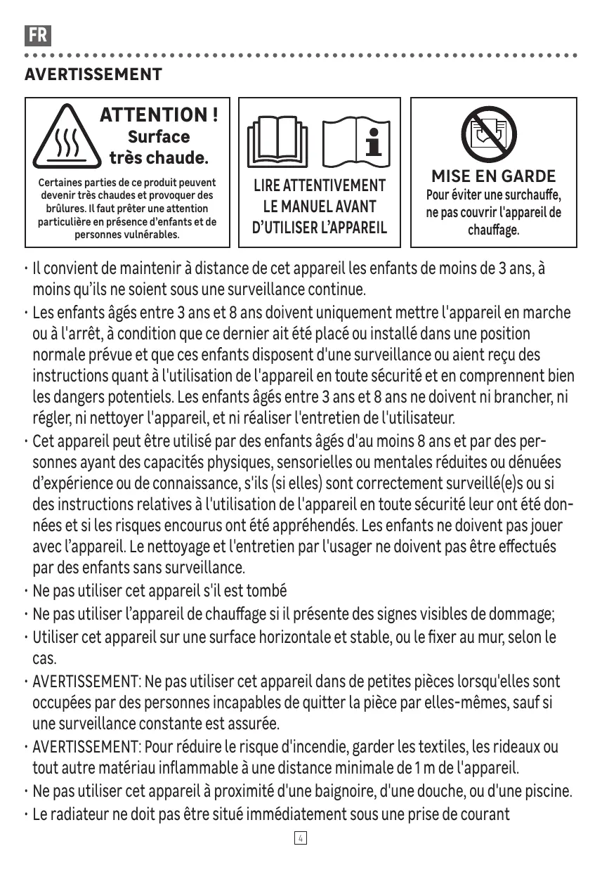 • Les enfants âgés entre 3 ans et 8 ans doivent uniquement mettre l'appareil en marche ou à l'arrêt, à condition que ce dernier ait été placé ou installé dans une position normale prévue et que ces enfants disposent d'une surveillance ou aient reçu des instructions quant à l'utilisation de l'appareil en toute sécurité et en comprennent bien les dangers potentiels. Les enfants âgés entre 3 ans et 8 ans ne doivent ni brancher, ni régler, ni nettoyer l'appareil, et ni réaliser l'entretien de l'utilisateur. • Cet appareil peut être utilisé par des enfants âgés d'au moins 8 ans et par des personnes ayant des capacités physiques, sensorielles ou mentales réduites ou dénuées d’expérience ou de connaissance, s'ils (si elles) sont correctement surveillé(e)s ou si des instructions relatives à l'utilisation de l'appareil en toute sécurité leur ont été données et si les risques encourus ont été appréhendés. Les enfants ne doivent pas jouer avec l’appareil. Le nettoyage et l'entretien par l'usager ne doivent pas être effectués par des enfants sans surveillance. • Ne pas utiliser cet appareil s'il est tombé • Ne pas utiliser l’appareil de chauffage si il présente des signes visibles de dommage; • Utiliser cet appareil sur une surface horizontale et stable, ou le fixer au mur, selon le cas. • AVERTISSEMENT: Ne pas utiliser cet appareil dans de petites pièces lorsqu'elles sont occupées par des personnes incapables de quitter la pièce par elles-mêmes, sauf si une surveillance constante est assurée. • AVERTISSEMENT: Pour réduire le risque d'incendie, garder les textiles, les rideaux ou tout autre matériau inflammable à une distance minimale de 1 m de l'appareil. • Ne pas utiliser cet appareil à proximité d'une baignoire, d'une douche, ou d'une piscine. • Le radiateur ne doit pas être situé immédiatement sous une prise de courant 4
