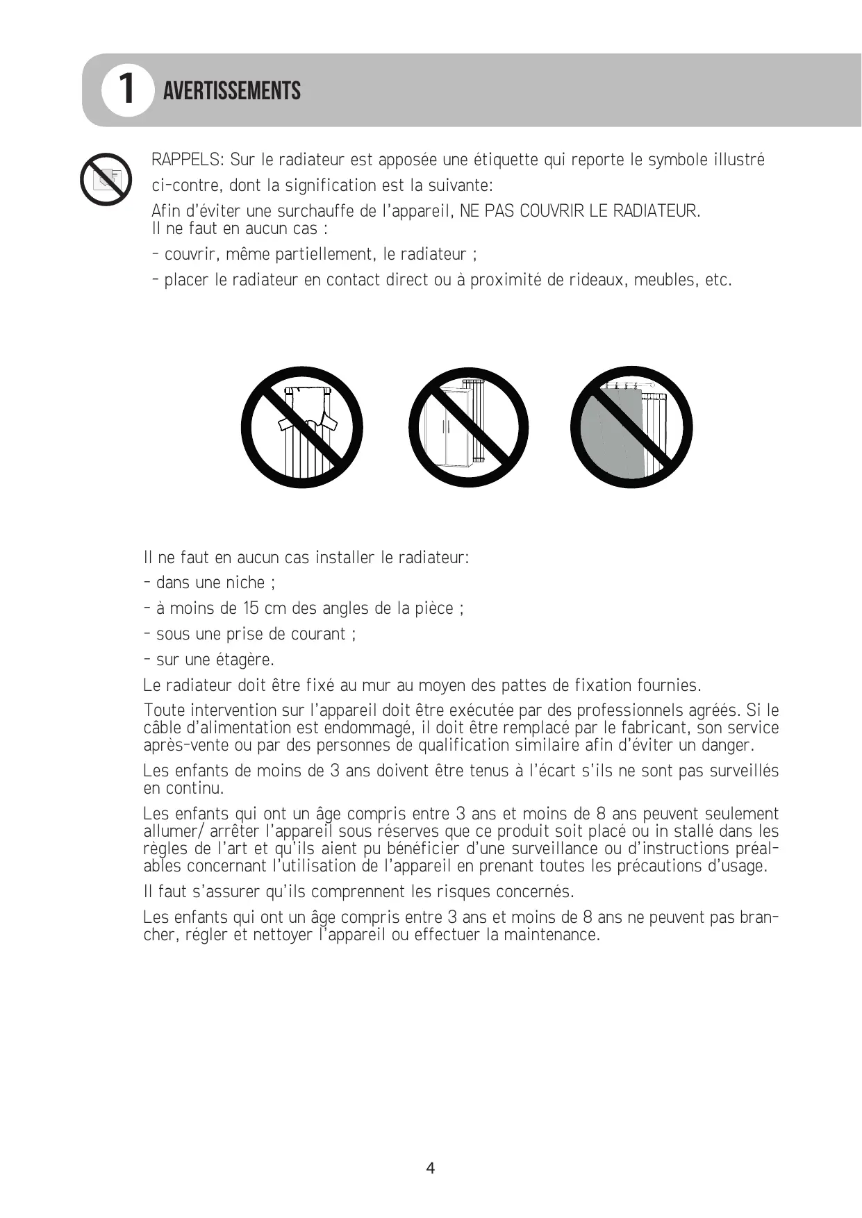 Avertissements 11 AVERTISSEMENTS AVERTISSEMENTS RAPPELS: Sur le radiateur est apposée une étiquette qui reporte le symbole illustré ci-contre, dont la signification est la suivante: Afin d’éviter une surchauffe de l’appareil, NE PAS COUVRIR LE RADIATEUR. Il ne faut en aucun cas : - couvrir, même partiellement, le radiateur ; - placer le radiateur en contact direct ou à proximité de rideaux, meubles, etc. Il ne faut en aucun cas installer le radiateur: - dans une niche ; - à moins de 15 cm des angles de la pièce ; - sous une prise de courant ; - sur une étagère. Le radiateur doit être fixé au mur au moyen des pattes de fixation fournies. Toute intervention sur l’appareil doit être exécutée par des professionnels agréés. Si le câble d’alimentation est endommagé, il doit être remplacé par le fabricant, son service après-vente ou par des personnes de qualification similaire afin d’éviter un danger. Les enfants de moins de 3 ans doivent être tenus à l’écart s’ils ne sont pas surveillés en continu. Les enfants qui ont un âge compris entre 3 ans et moins de 8 ans peuvent seulement allumer/ arrêter l’appareil sous réserves que ce produit soit placé ou in stallé dans les règles de l’art et qu’ils aient pu bénéficier d’une surveillance ou d’instructions préalables concernant l’utilisation de l’appareil en prenant toutes les précautions d’usage. Il faut s’assurer qu’ils comprennent les risques concernés. Les enfants qui ont un âge compris entre 3 ans et moins de 8 ans ne peuvent pas brancher, régler et nettoyer l’appareil ou effectuer la maintenance.