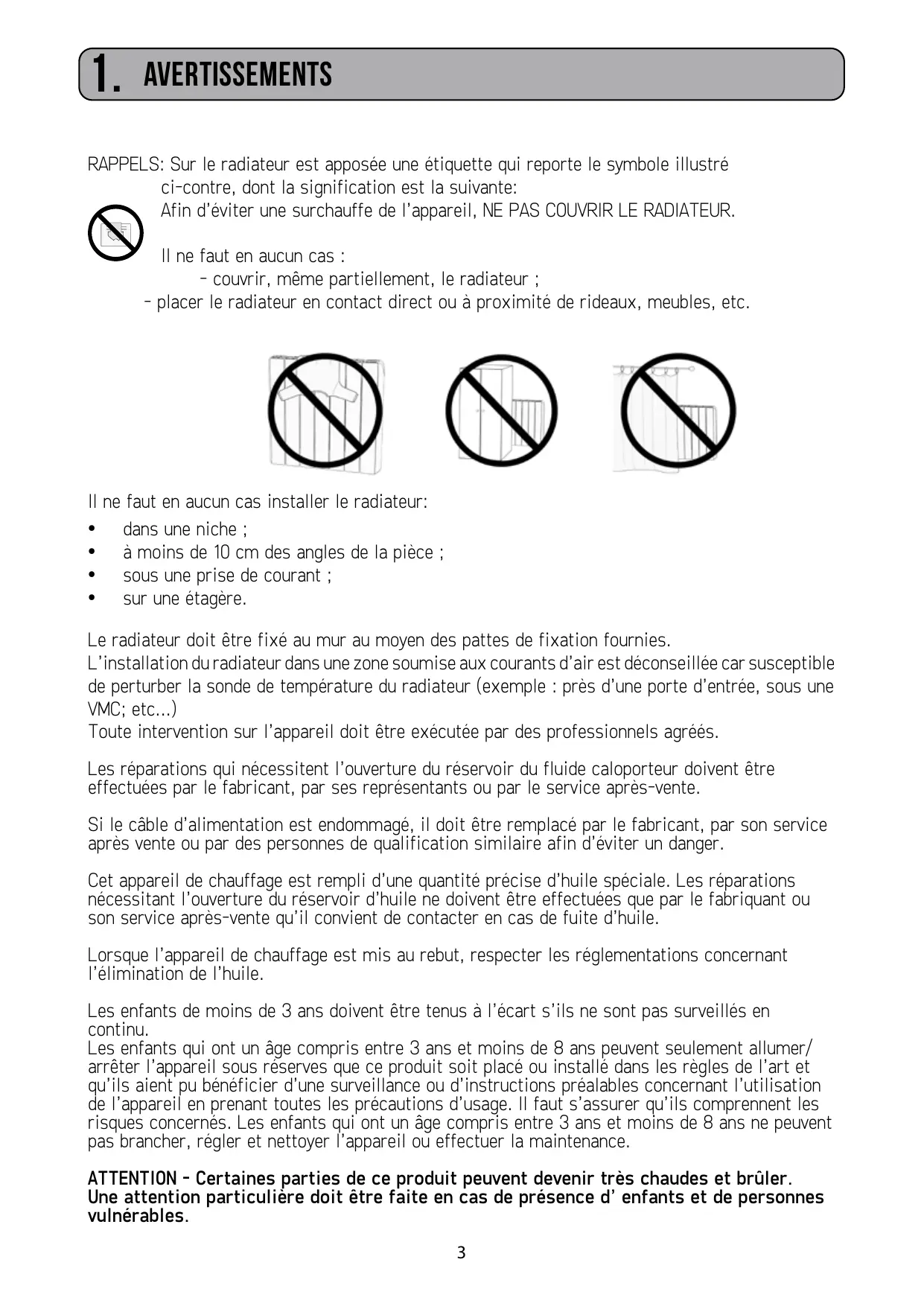 • dans une niche ; • à moins de 10 cm des angles de la pièce ; • sous une prise de courant ; • sur une étagère. Le radiateur doit être fixé au mur au moyen des pattes de fixation fournies. L’installation du radiateur dans une zone soumise aux courants d’air est déconseillée car susceptible de perturber la sonde de température du radiateur (exemple : près d’une porte d’entrée, sous une VMC; etc...) Toute intervention sur l’appareil doit être exécutée par des professionnels agréés. Les réparations qui nécessitent l’ouverture du réservoir du fluide caloporteur doivent être effectuées par le fabricant, par ses représentants ou par le service après-vente. Si le câble d’alimentation est endommagé, il doit être remplacé par le fabricant, par son service après vente ou par des personnes de qualification similaire afin d’éviter un danger. Cet appareil de chauffage est rempli d’une quantité précise d’huile spéciale. Les réparations nécessitant l’ouverture du réservoir d’huile ne doivent être effectuées que par le fabriquant ou son service après-vente qu’il convient de contacter en cas de fuite d’huile. Lorsque l’appareil de chauffage est mis au rebut, respecter les réglementations concernant l’élimination de l’huile. Les enfants de moins de 3 ans doivent être tenus à l’écart s’ils ne sont pas surveillés en continu. Les enfants qui ont un âge compris entre 3 ans et moins de 8 ans peuvent seulement allumer/ arrêter l’appareil sous réserves que ce produit soit placé ou installé dans les règles de l’art et qu’ils aient pu bénéficier d’une surveillance ou d’instructions préalables concernant l’utilisation de l’appareil en prenant toutes les précautions d’usage. Il faut s’assurer qu’ils comprennent les risques concernés. Les enfants qui ont un âge compris entre 3 ans et moins de 8 ans ne peuvent pas brancher, régler et nettoyer l’appareil ou effectuer la maintenance. ATTENTION – Certaines parties de ce produit peuvent devenir très chaudes et brûler. Une attention particulière doit être faite en cas de présence d’ enfants et de personnes vulnérables. 3