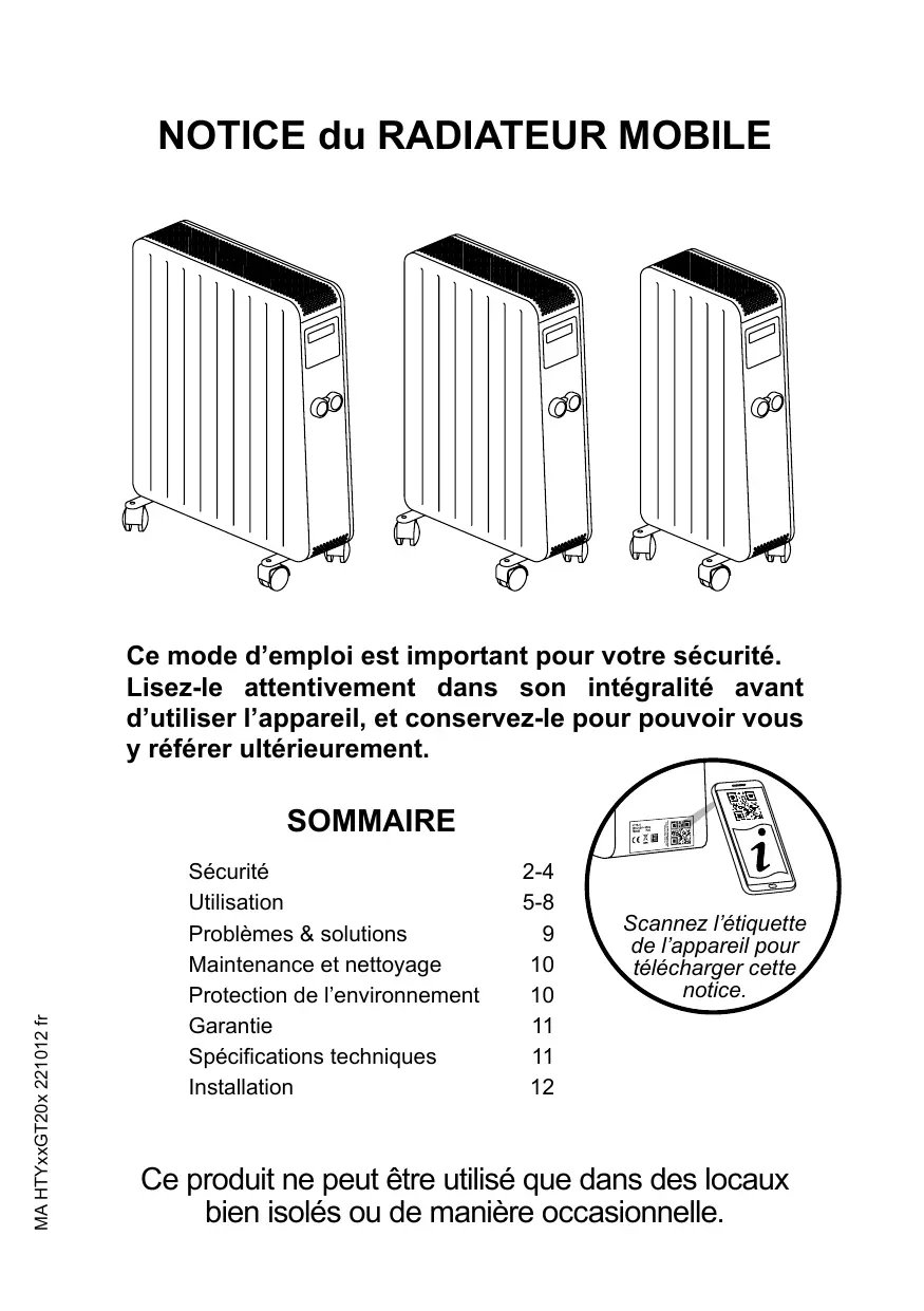 NOTICE du RADIATEUR MOBILE Ce mode d’emploi est important pour votre sécurité. Lisez-le attentivement dans son intégralité avant d’utiliser l’appareil, et conservez-le pour pouvoir vous y référer ultérieurement. MA HTYxxGT20x 221012 fr SOMMAIRE Sécurité Utilisation Problèmes & solutions Maintenance et nettoyage Protection de l’environnement Garantie Spécifications techniques Installation 2-4 5-8