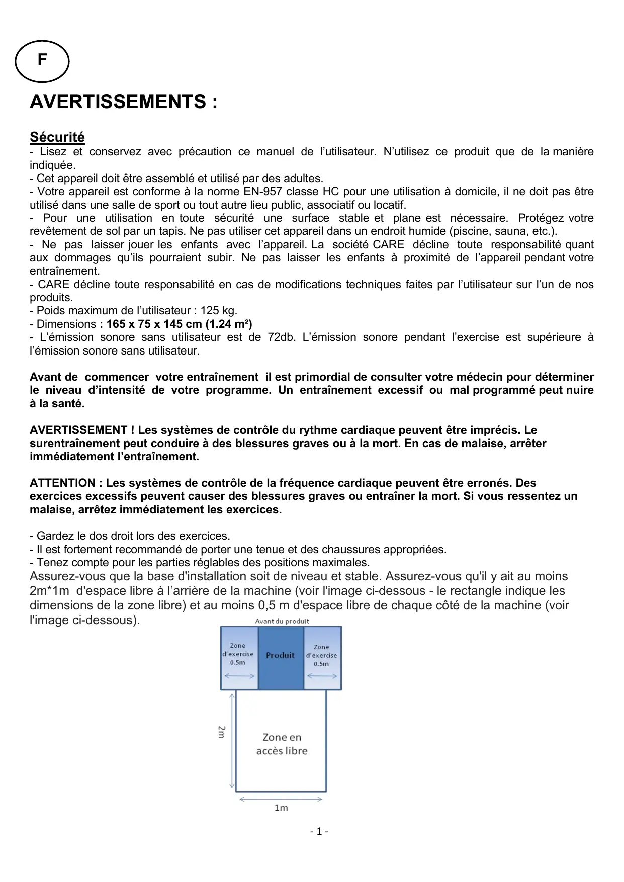 - Votre appareil est conforme à la norme EN-957 classe HC pour une utilisation à domicile, il ne doit pas être utilisé dans une salle de sport ou tout autre lieu public, associatif ou locatif. - Pour une utilisation en toute sécurité une surface stable et plane est nécessaire. Protégez votre revêtement de sol par un tapis. Ne pas utiliser cet appareil dans un endroit humide (piscine, sauna, etc.). - Ne pas laisser jouer les enfants avec l’appareil. La société CARE décline toute responsabilité quant aux dommages qu’ils pourraient subir. Ne pas laisser les enfants à proximité de l’appareil pendant votre entraînement. - CARE décline toute responsabilité en cas de modifications techniques faites par l’utilisateur sur l’un de nos produits. - Poids maximum de l’utilisateur : 125 kg. - Dimensions : 165 x 75 x 145 cm (1.24 m²) - L’émission sonore sans utilisateur est de 72db. L’émission sonore pendant l’exercise est supérieure à l’émission sonore sans utilisateur. Avant de commencer votre entraînement il est primordial de consulter votre médecin pour déterminer le niveau d’intensité de votre programme. Un entraînement excessif ou mal programmé peut nuire à la santé. AVERTISSEMENT ! Les systèmes de contrôle du rythme cardiaque peuvent être imprécis. Le surentraînement peut conduire à des blessures graves ou à la mort. En cas de malaise, arrêter immédiatement l’entraînement. ATTENTION : Les systèmes de contrôle de la fréquence cardiaque peuvent être erronés. Des exercices excessifs peuvent causer des blessures graves ou entraîner la mort. Si vous ressentez un malaise, arrêtez immédiatement les exercices. - Gardez le dos droit lors des exercices. - Il est fortement recommandé de porter une tenue et des chaussures appropriées. - Tenez compte pour les parties réglables des positions maximales.