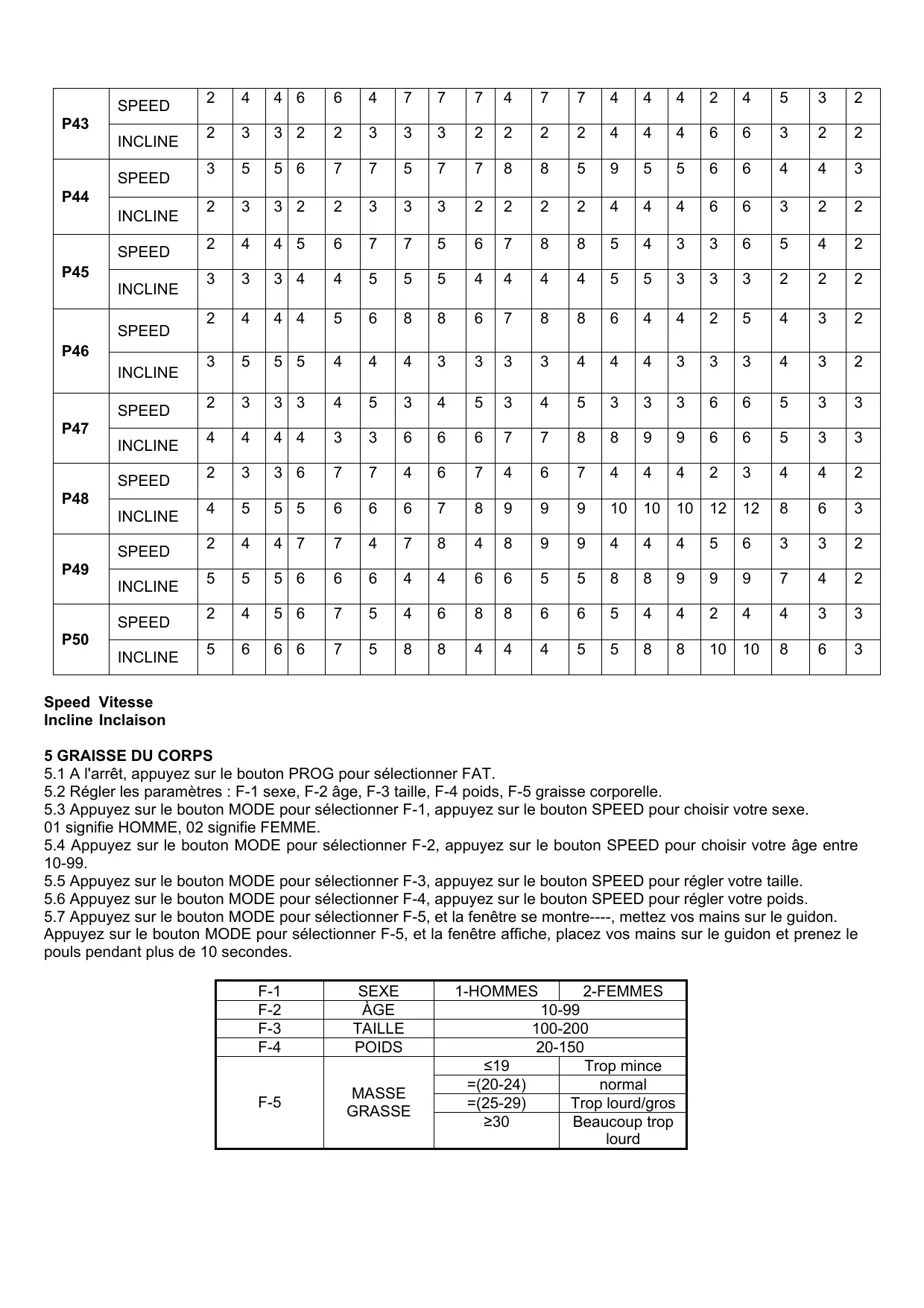 3.3 La touche « INC + / - » En fonctionnement, une pression sur ces touches permet d'augmenter ou de diminuer l'inclinaison d'un niveau à chaque fois ; Si vous appuyez sur ces touches pendant plus de 3 secondes, l'inclinaison augmentera ou diminuera constamment. 3.4 La touche « MODE » : la touche « MODE » à l’état d’arrêt permet de sélectionner le temps, la distance et les calories de façon circulaire. 3.5 Haut-parleur Bluetooth pour écouter de la musique 3.6 Touches de vitesse rapide : 3 KM 3.7 Touches d’inclinaison rapide : 3 Inclinaison 3.8 PROG : Utilisez cette touche pour choisir les programmes : P01-P50 sont des programmes préréglés/ HR1-HR2-HR3 sont des programmes de contrôle de la fréquence cardiaque / MASSE GRASSE : Mesure la masse grasse