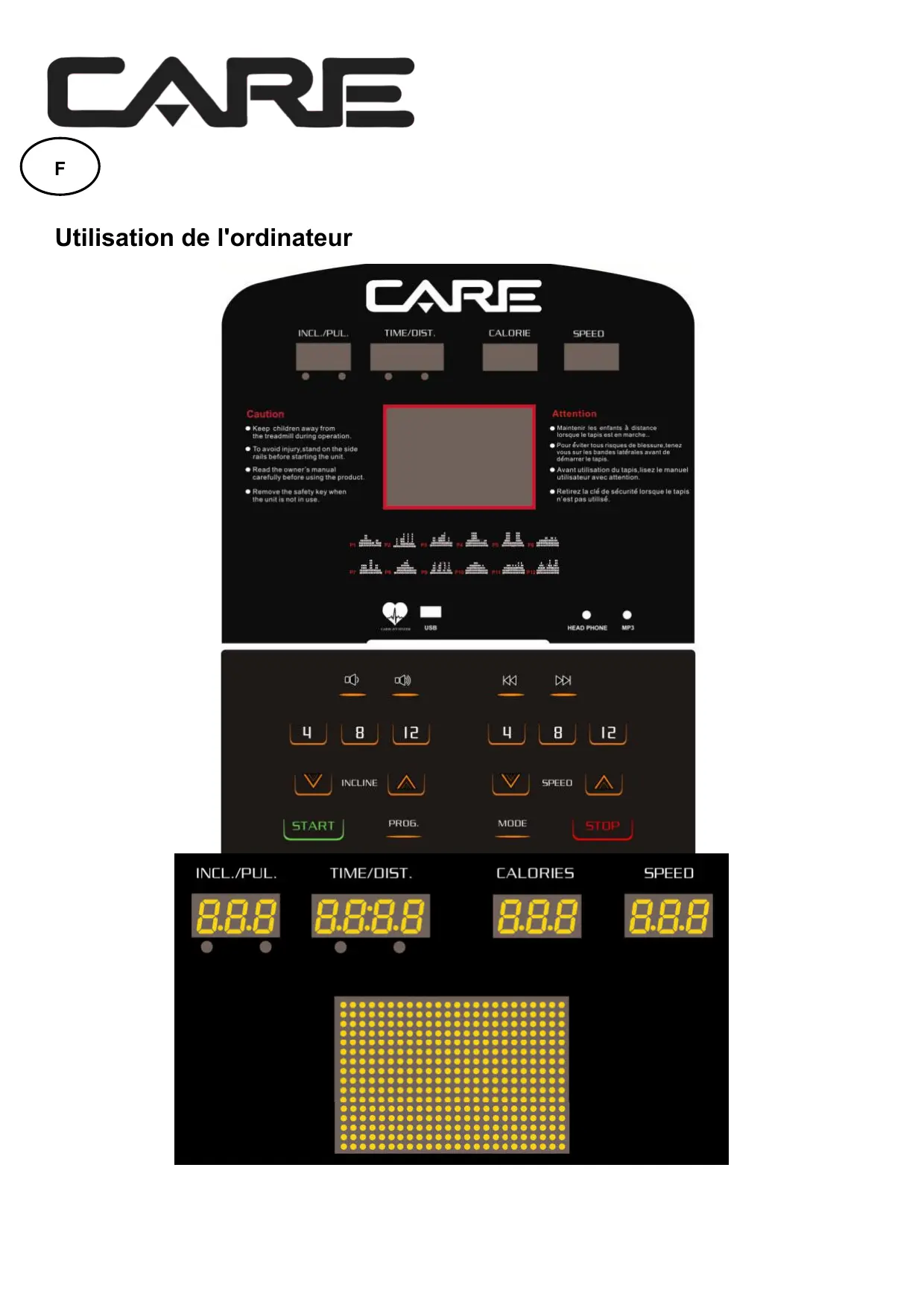 « BIENVENUE », puis vous passez en mode manuel après 3 secondes. Si vous retirez la clé de sécurité, le grand écran indique VERROUILLAGE DE PROTECTION Si vous replacez la clé de sécurité, le grand écran indique SÉLECTIONNEZ LE PROGRAMME OU APPUYEZ SUR START POUR COMMENCER. 7. PARAMÈTRES DES MODES Appuyez sur le bouton MODE, et choisissez entre : time count-down (compte à rebours du temps),distance count-down (compte à rebours de la distance) et calories count-down (compte à rebours des calories). Le grand champ affiche alors le message suivant : AJUSTEZ LE TEMPS ET APPUYEZ SUR START AJUSTEZ LA DISTANCE ET APPUYEZ SUR START AJUSTEZ LES CALORIES ET APPUYEZ SUR START Appuyez sur le bouton « MODE » et choisissez entre : time countdown (compte à rebours du temps)、 distance countdown (compte à rebours de la distance) et carolies countdown (compte à rebours des calories). Le champ affiche alors une valeur par défaut et s’éclaire. Cliquez sur le bouton « SPEED +/- » pour ajuster la valeur jusqu’à celle souhaitée. Appuyez sur le bouton START. Le tapis se met en route à la vitesse la plus basse au bout de 3 secondes. Appuyez sur « SPEED +/- », « 4/8/12 » ou faites tourner le côté droit du guidon pour ajuster la vitesse. Appuyez sur « INCLINE +/- », « 4/8/12 » ou faites tourner le côté gauche du guidon pour ajuster l’inclinaison. Une fois que le compte à rebours atteint 0, le tapis s’arrête progressivement. Vous pouvez également appuyer sur le bouton « STOP » ou retirez la clé de sécurité pour arrêter l’appareil. 8. PROGRAMME INTÉGRÉ À l’arrêt, appuyez sur le bouton PROG. Le champ SPEED affiche alors « P1-P20 ». Choisissez le programme désiré entre P1 et P20. Le champ TIME affiche alors la valeur par défaut (30:00) et clignote. Appuyez sur les boutons « SPEED+ » ou « INCLINE+ » pour ajuster le temps à votre convenance. Appuyez sur le bouton START pour lancer le programme intégré. Au total, le programme intégré est composé de 16 sessions et le temps de course de chaque session équivaut à « temps de course/16 ». Au moment de passer à la session suivante, un « bip » retentit pour vous en informer. La vitesse du tapis change en même temps que le programme. Vous pouvez également ajuster la vitesse grâce au bouton « SPEED +/- » pendant la course, mais la vitesse par défaut se rétablit lorsque vous passez à la session suivante. Une fois toutes les sessions terminées, l’appareil émet dix fois le son « bip », puis le message « End » s’affiche. À ce moment-là, appuyez sur le bouton « STOP » pour effectuer une restauration du tapis et le mettre hors tension. Le mode manuel est le programme par défaut, la vitesse par défaut est la vitesse minimale (0,2 km/h) et la vitesse maximale est 14 km/h.