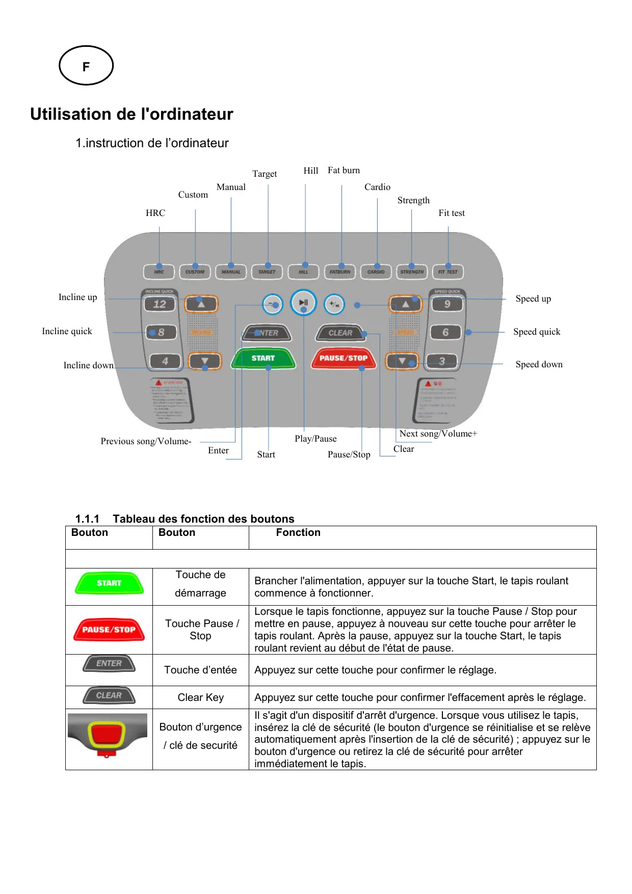 Touche de réglache de la vitesse Touche directe de vitesse Touche de réglage de l'inclinaison