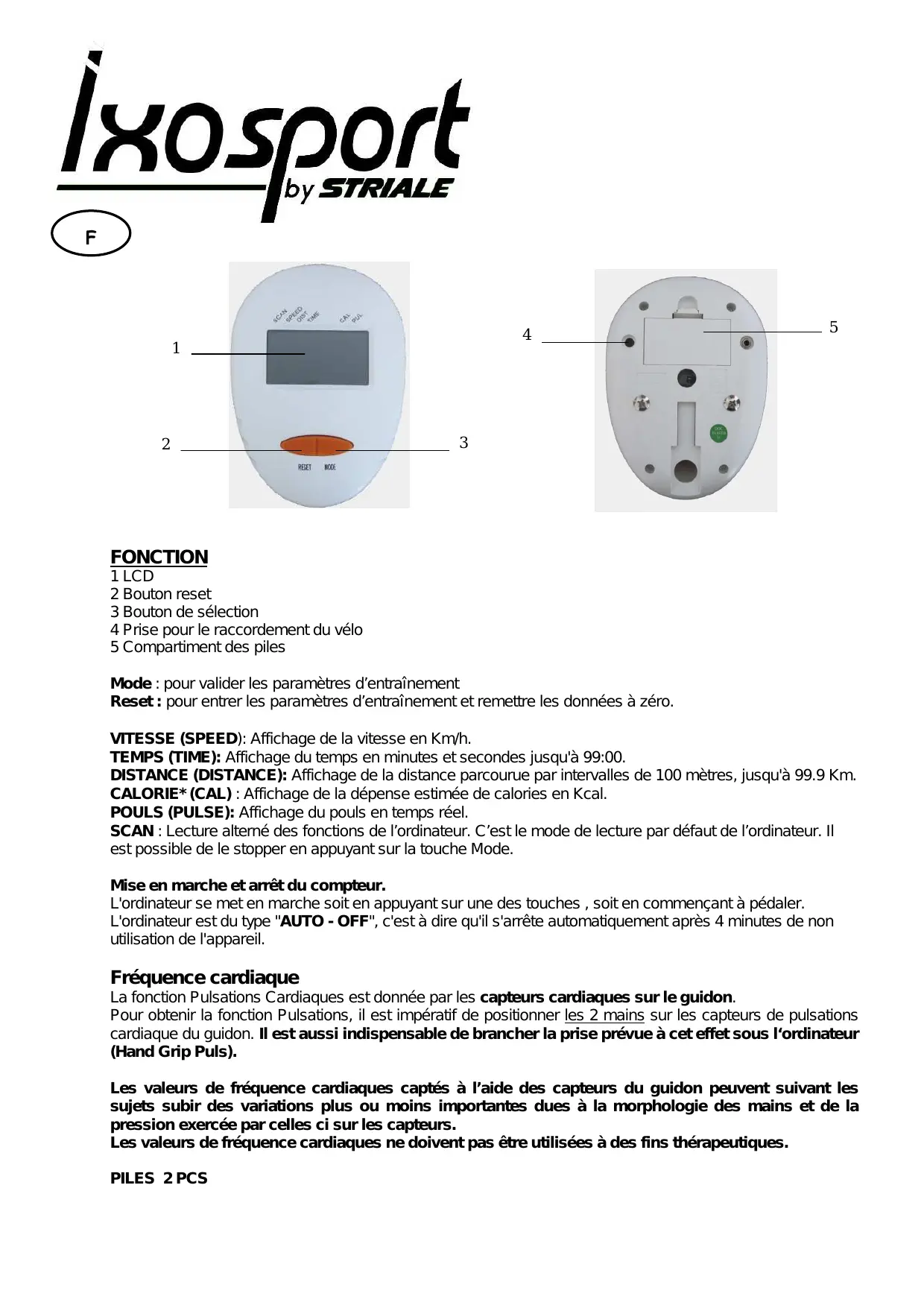 FONCTION 1 LCD 2 Bouton reset 3 Bouton de sélection 4 Prise pour le raccordement du vélo 5 Compartiment des piles Mode : pour valider les paramètres d’entraînement Reset : pour entrer les paramètres d’entraînement et remettre les données à zéro. VITESSE (SPEED): Affichage de la vitesse en Km/h. TEMPS (TIME): Affichage du temps en minutes et secondes jusqu'à 99:00. DISTANCE (DISTANCE): Affichage de la distance parcourue par intervalles de 100 mètres, jusqu'à 99.9 Km. CALORIE* (CAL) : Affichage de la dépense estimée de calories en Kcal. POULS (PULSE): Affichage du pouls en temps réel. SCAN : Lecture alterné des fonctions de l’ordinateur. C’est le mode de lecture par défaut de l’ordinateur. Il est possible de le stopper en appuyant sur la touche Mode. Mise en marche et arrêt du compteur. L'ordinateur se met en marche soit en appuyant sur une des touches , soit en commençant à pédaler. L'ordinateur est du type "AUTO - OFF", c'est à dire qu'il s'arrête automatiquement après 4 minutes de non utilisation de l'appareil. Fréquence cardiaque La fonction Pulsations Cardiaques est donnée par les capteurs cardiaques sur le guidon. Pour obtenir la fonction Pulsations, il est impératif de positionner les 2 mains sur les capteurs de pulsations cardiaque du guidon. Il est aussi indispensable de brancher la prise prévue à cet effet sous l‘ordinateur (Hand Grip Puls). Les valeurs de fréquence cardiaques captés à l’aide des capteurs du guidon peuvent suivant les sujets subir des variations plus ou moins importantes dues à la morphologie des mains et de la pression exercée par celles ci sur les capteurs. Les valeurs de fréquence cardiaques ne doivent pas être utilisées à des fins thérapeutiques. PILES 2 PCS
