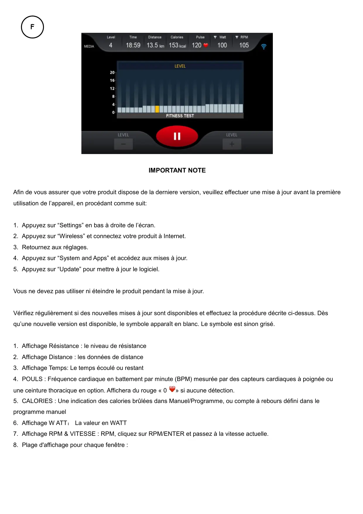 RÉSUMÉ 5.7 La valeur par défaut est le niveau le plus bas. La résistance ne peut pas être ajustée pendant l'entraînement. 5.8 Appuyez sur la touche STOP, la résistance revient à 0 , la fenêtre principale affiche « PAUSE » , appuyez sur la touche START pour redémarrer.