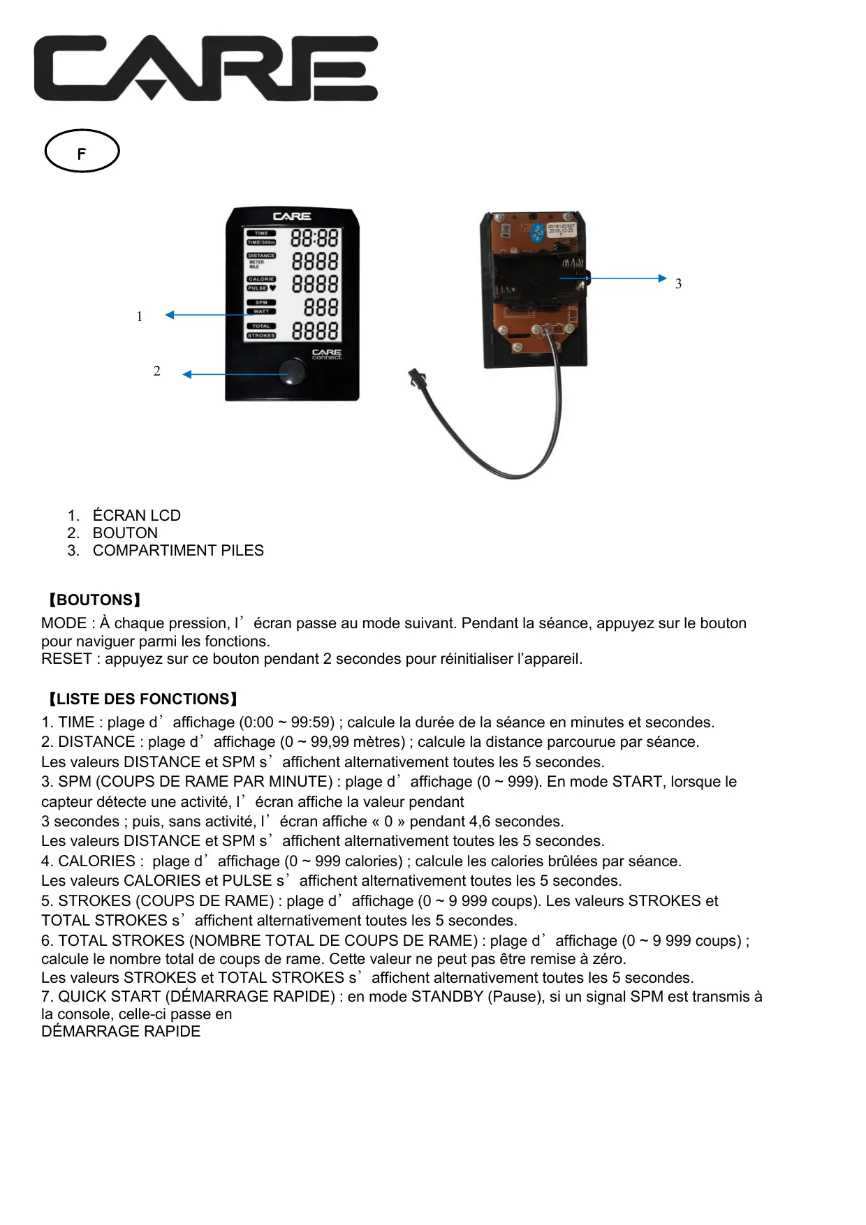 1. TIME : plage d’affichage (0:00 ~ 99:59) ; calcule la durée de la séance en minutes et secondes. 2. DISTANCE : plage d’affichage (0 ~ 99,99 mètres) ; calcule la distance parcourue par séance. Les valeurs DISTANCE et SPM s’affichent alternativement toutes les 5 secondes. 3. SPM (COUPS DE RAME PAR MINUTE) : plage d’affichage (0 ~ 999). En mode START, lorsque le capteur détecte une activité, l’écran affiche la valeur pendant 3 secondes ; puis, sans activité, l’écran affiche « 0 » pendant 4,6 secondes. Les valeurs DISTANCE et SPM s’affichent alternativement toutes les 5 secondes. 4. CALORIES : plage d’affichage (0 ~ 999 calories) ; calcule les calories brûlées par séance. Les valeurs CALORIES et PULSE s’affichent alternativement toutes les 5 secondes. 5. STROKES (COUPS DE RAME) : plage d’affichage (0 ~ 9 999 coups). Les valeurs STROKES et TOTAL STROKES s’affichent alternativement toutes les 5 secondes. 6. TOTAL STROKES (NOMBRE TOTAL DE COUPS DE RAME) : plage d’affichage (0 ~ 9 999 coups) ; calcule le nombre total de coups de rame. Cette valeur ne peut pas être remise à zéro. Les valeurs STROKES et TOTAL STROKES s’affichent alternativement toutes les 5 secondes. 7. QUICK START (DÉMARRAGE RAPIDE) : en mode STANDBY (Pause), si un signal SPM est transmis à la console, celle-ci passe en