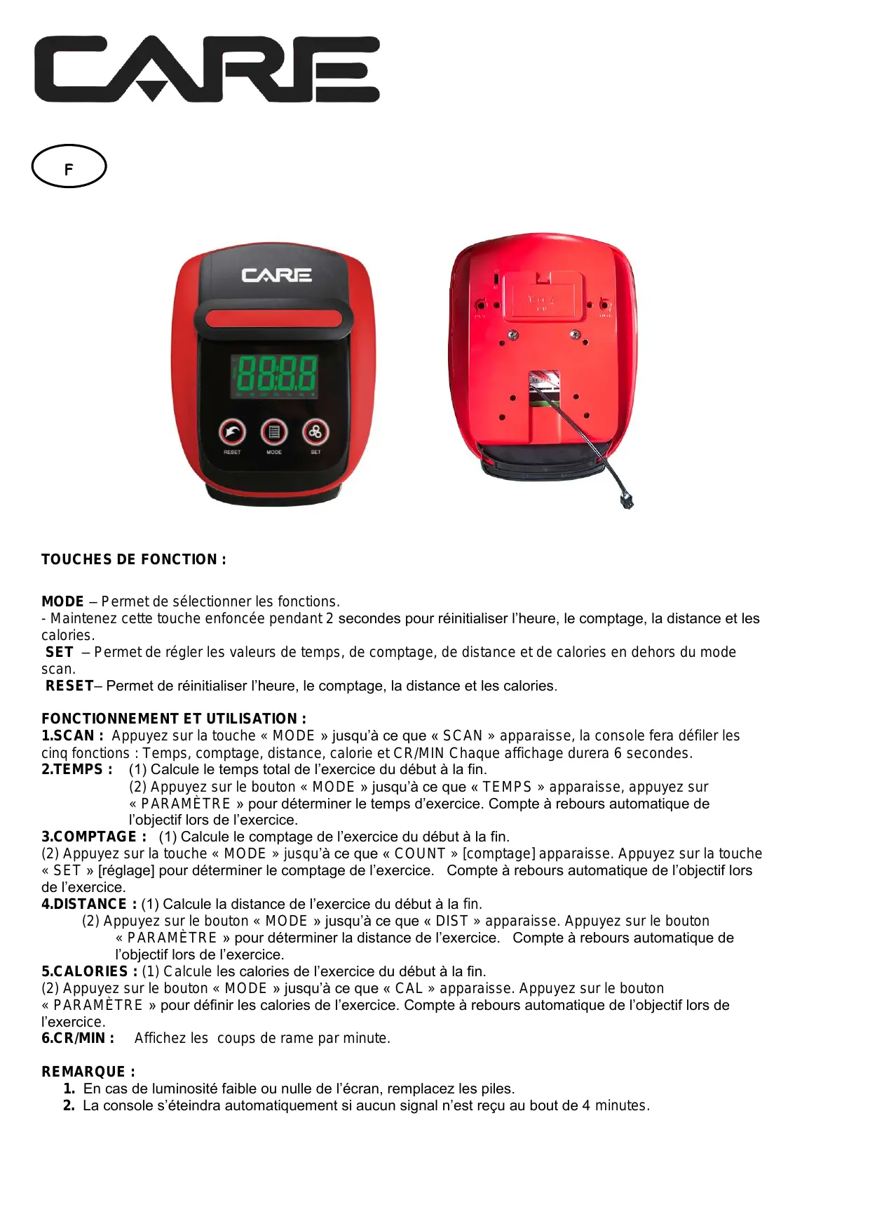 - Maintenez cette touche enfoncée pendant 2 secondes pour réinitialiser l’heure, le comptage, la distance et les calories. SET – Permet de régler les valeurs de temps, de comptage, de distance et de calories en dehors du mode scan. RESET– Permet de réinitialiser l’heure, le comptage, la distance et les calories . FONCTIONNEMENT ET UTILISATION : 1.SCAN : Appuyez sur la touche « MODE » jusqu’à ce que « SCAN » apparaisse, la console fera défiler les cinq fonctions : Temps, comptage, distance, calorie et CR/MIN Chaque affichage durera 6 secondes. 2.TEMPS : (1) Calcule le temps total de l’exercice du début à la fin. (2) Appuyez sur le bouton « MODE » jusqu’à ce que « TEMPS » apparaisse, appuyez sur « PARAMÈTRE » pour déterminer le temps d’exercice. Compte à rebours automatique de l’objectif lors de l’exercice. 3.COMPTAGE : (1) Calcule le comptage de l’exercice du début à la fin. (2) Appuyez sur la touche « MODE » jusqu’à ce que « COUNT » [comptage] apparaisse. Appuyez sur la touche « SET » [réglage] pour déterminer le comptage de l’exercice. Compte à rebours automatique de l’objectif lors de l’exercice. 4.DISTANCE : (1) Calcule la distance de l’exercice du début à la fin. (2) Appuyez sur le bouton « MODE » jusqu’à ce que « DIST » apparaisse. Appuyez sur le bouton « PARAMÈTRE » pour déterminer la distance de l’exercice. Compte à rebours automatique de l’objectif lors de l’exercice. 5.CALORIES : (1) Calcule les calories de l’exercice du début à la fin. (2) Appuyez sur le bouton « MODE » jusqu’à ce que « CAL » apparaisse. Appuyez sur le bouton « PARAMÈTRE » pour définir les calories de l’exercice. Compte à rebours automatique de l’objectif lors de l’exercice. 6.CR/MIN : Affichez les coups de rame par minute. REMARQUE : 1. En cas de luminosité faible ou nulle de l’écran, remplacez les piles. 2. La console s’éteindra automatiquement si aucun signal n’est reçu au bout de 4 minutes.