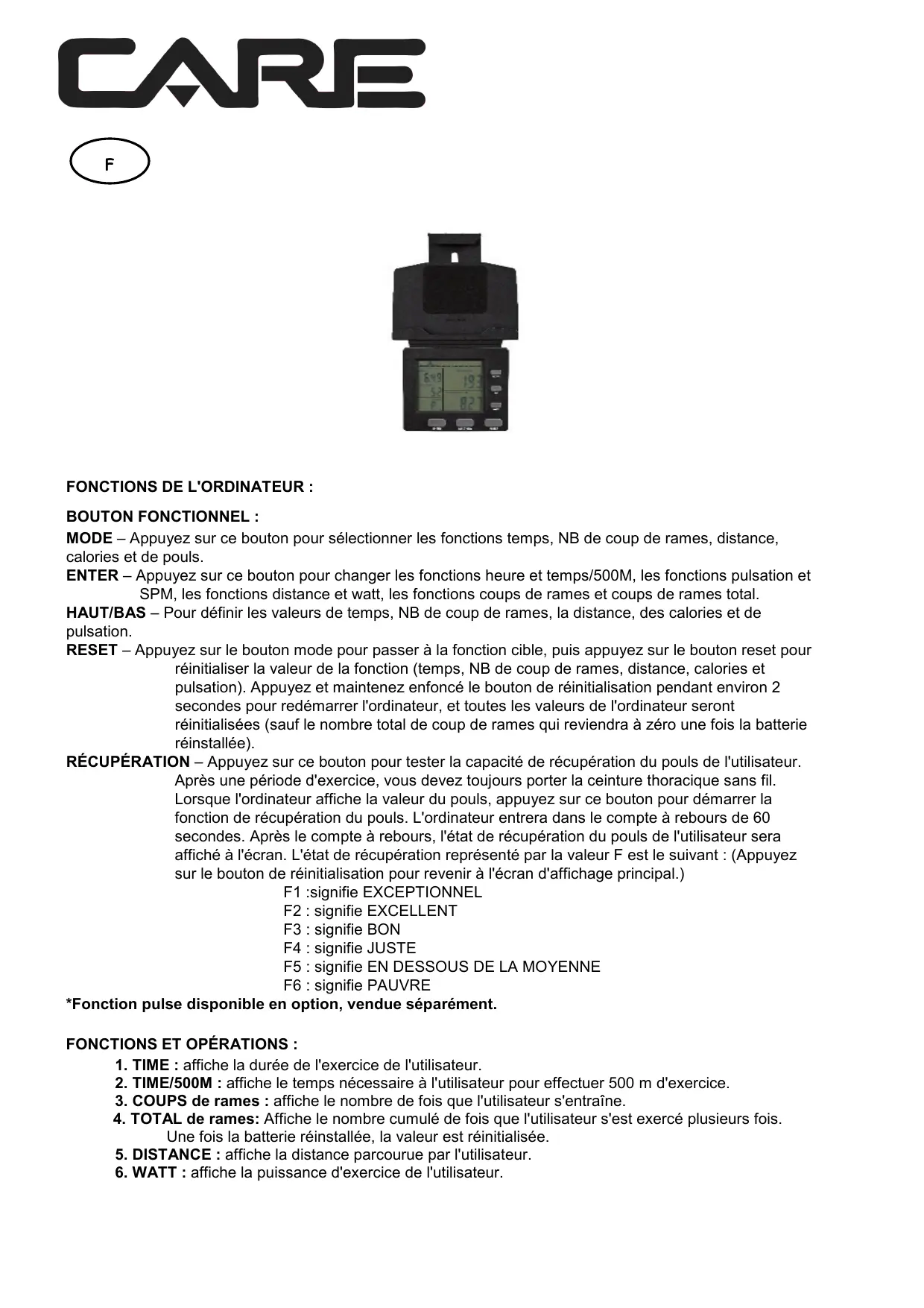 SPM, les fonctions distance et watt, les fonctions coups de rames et coups de rames total. HAUT/BAS – Pour définir les valeurs de temps, NB de coup de rames, la distance, des calories et de pulsation. RESET – Appuyez sur le bouton mode pour passer à la fonction cible, puis appuyez sur le bouton reset pour réinitialiser la valeur de la fonction (temps, NB de coup de rames, distance, calories et pulsation). Appuyez et maintenez enfoncé le bouton de réinitialisation pendant environ 2 secondes pour redémarrer l'ordinateur, et toutes les valeurs de l'ordinateur seront réinitialisées (sauf le nombre total de coup de rames qui reviendra à zéro une fois la batterie réinstallée). RÉCUPÉRATION – Appuyez sur ce bouton pour tester la capacité de récupération du pouls de l'utilisateur. Après une période d'exercice, vous devez toujours porter la ceinture thoracique sans fil. Lorsque l'ordinateur affiche la valeur du pouls, appuyez sur ce bouton pour démarrer la fonction de récupération du pouls. L'ordinateur entrera dans le compte à rebours de 60 secondes. Après le compte à rebours, l'état de récupération du pouls de l'utilisateur sera affiché à l'écran. L'état de récupération représenté par la valeur F est le suivant : (Appuyez sur le bouton de réinitialisation pour revenir à l'écran d'affichage principal.) F1 :signifie EXCEPTIONNEL F2 : signifie EXCELLENT F3 : signifie BON F4 : signifie JUSTE F5 : signifie EN DESSOUS DE LA MOYENNE F6 : signifie PAUVRE *Fonction pulse disponible en option, vendue séparément. FONCTIONS ET OPÉRATIONS : 1. TIME : affiche la durée de l'exercice de l'utilisateur. 2. TIME/500M : affiche le temps nécessaire à l'utilisateur pour effectuer 500 m d'exercice. 3. COUPS de rames : affiche le nombre de fois que l'utilisateur s'entraîne. 4. TOTAL de rames: Affiche le nombre cumulé de fois que l'utilisateur s'est exercé plusieurs fois. Une fois la batterie réinstallée, la valeur est réinitialisée. 5. DISTANCE : affiche la distance parcourue par l'utilisateur. 6. WATT : affiche la puissance d'exercice de l'utilisateur.