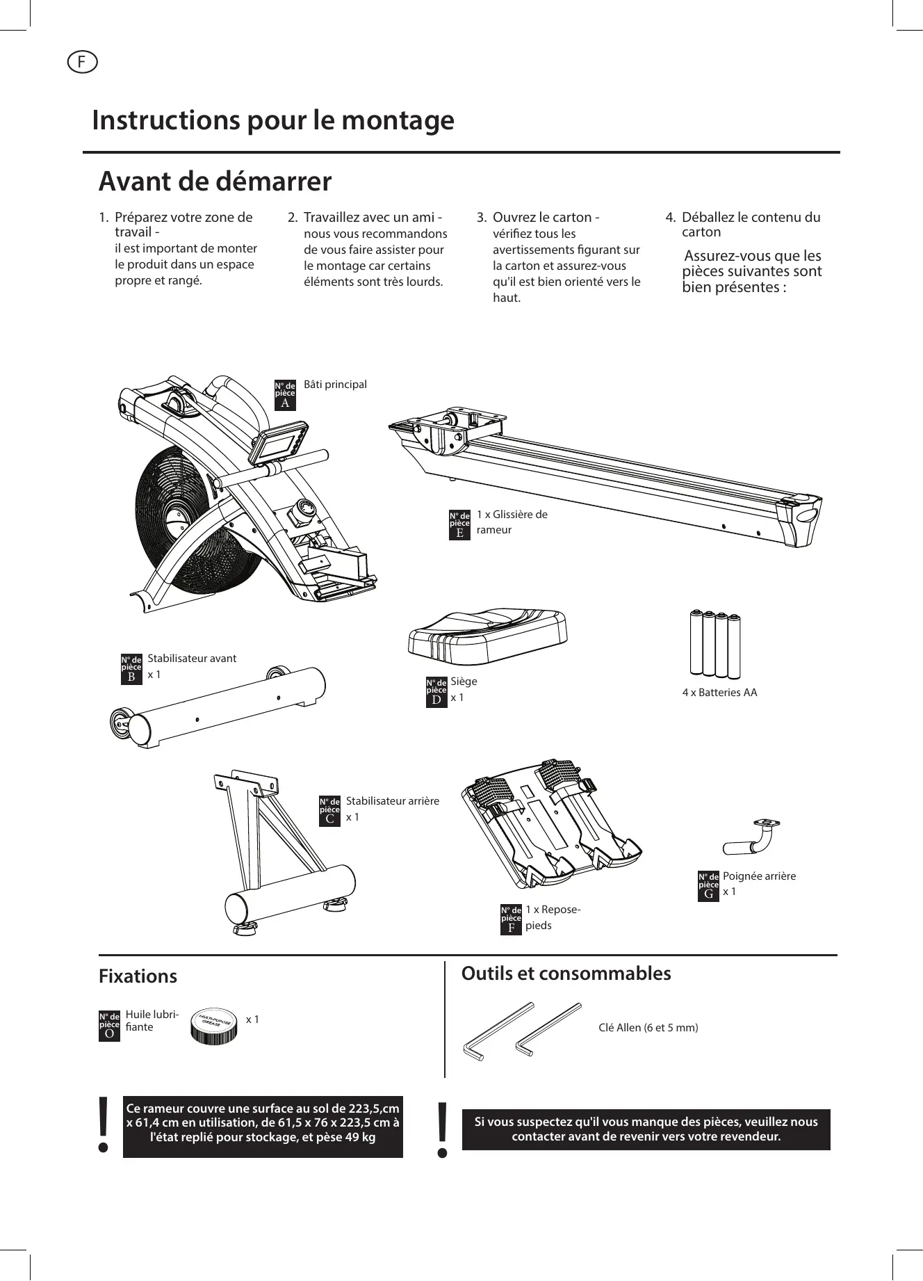 N° de pièce 1 x Glissière de rameur Stabilisateur avant B x1 N° de pièce Siège 4 x Batteries AA D x1 N° de pièce