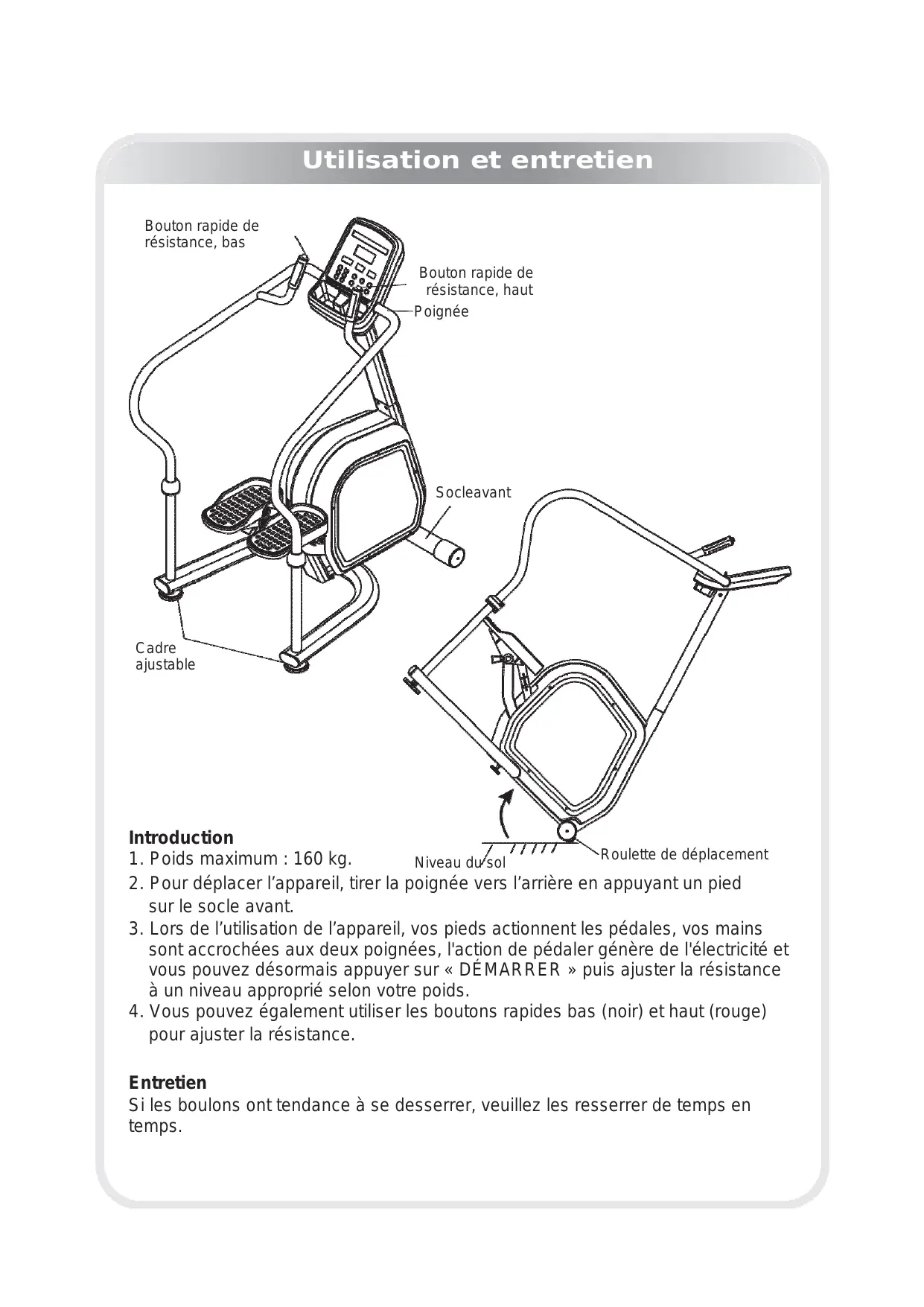 Sécurité - Lisez et conservez avec précaution ce manuel de l’utilisateur. N’utilisez ce produit que de la manière indiquée. - Cet appareil doit être assemblé et utilisé par des adultes. - Votre appareil est conforme à la norme EN-957 classe SA pour une utilisation à domicile et en salle de sport. - Pour une utilisation en toute sécurité une surface stable et plane est nécessaire. Protégez votre revêtement de sol par un tapis. Ne pas utiliser cet appareil dans un endroit humide (piscine, sauna, etc.). - Ne pas laisser jouer les enfants avec l’appareil. La société CARE décline toute responsabilité quant aux dommages qu’ils pourraient subir. Ne pas laisser les enfants à proximité de l’appareil pendant votre entraînement. - CARE décline toute responsabilité en cas de modifications techniques faites par l’utilisateur sur l’un de nos produits. - Poids et taille maximum de l’utilisateur : 160 kg. - Avant de commencer votre entraînement il est primordial de consulter votre médecin pour déterminer le niveau d’intensité de votre programme. Un entraînement excessif ou mal programmé peut nuire à la santé. - Gardez le dos droit lors des exercices. - Il est fortement recommandé de porter une tenue et des chaussures appropriées. - Tenez compte pour les parties réglables des positions maximales. Entretien - Vérifier régulièrement le serrage des éléments de fixation avec les vis et les écrous. Pour garder son niveau de sécurité, votre appareil doit être examiné régulièrement. Il est impératif de remplacer toute pièce défectueuse et de ne plus l’utiliser jusqu’à sa complète réparation. - La sueur étant très corrosive ne pas laisser celle-ci entrer en contact avec les parties émaillées ou chromées de l'appareil, et particulièrement l'ordinateur, essuyer immédiatement votre appareil après entraînement. Le nettoyage des parties émaillées se fait à l’aide d’une éponge imprégnée d'eau. Tous produits agressifs ou corrosifs sont à proscrire. Garantie : Le châssis est garanti 3 ans. Les pièces d’usures sont garanties 1 an. La garantie s’applique en utilisation normale. Recyclage : le symbole « poubelle barrée » signifie que ce produit et les piles qu’il peut contenir ne peuvent être jetés avec les déchets domestiques. Ils font l’objet d’un tri sélectif spécifique. Déposez les batteries ainsi que votre produit électronique en fin de vie dans un espace de collecte autorisé afin de les recycler. Cette valorisation de vos déchets électroniques permettra la protection de l’environnement et de votre santé. Utilisation et entretien Bouton rapide de résistance, bas Bouton rapide de résistance, haut Poignée Socleavant Cadre ajustable Introduction Roulette de déplacement