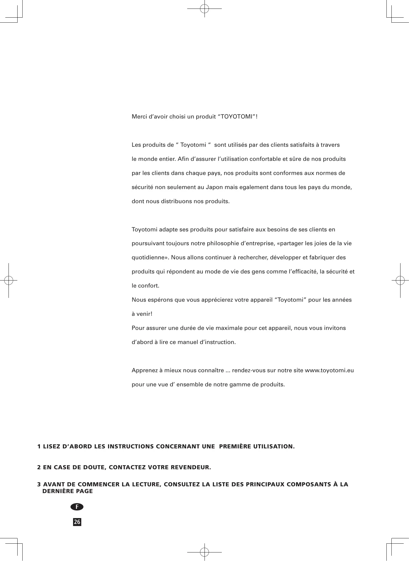Nous espérons que vous apprécierez votre appareil “Toyotomi” pour les années à venir! Pour assurer une durée de vie maximale pour cet appareil, nous vous invitons d’abord à lire ce manuel d’instruction.