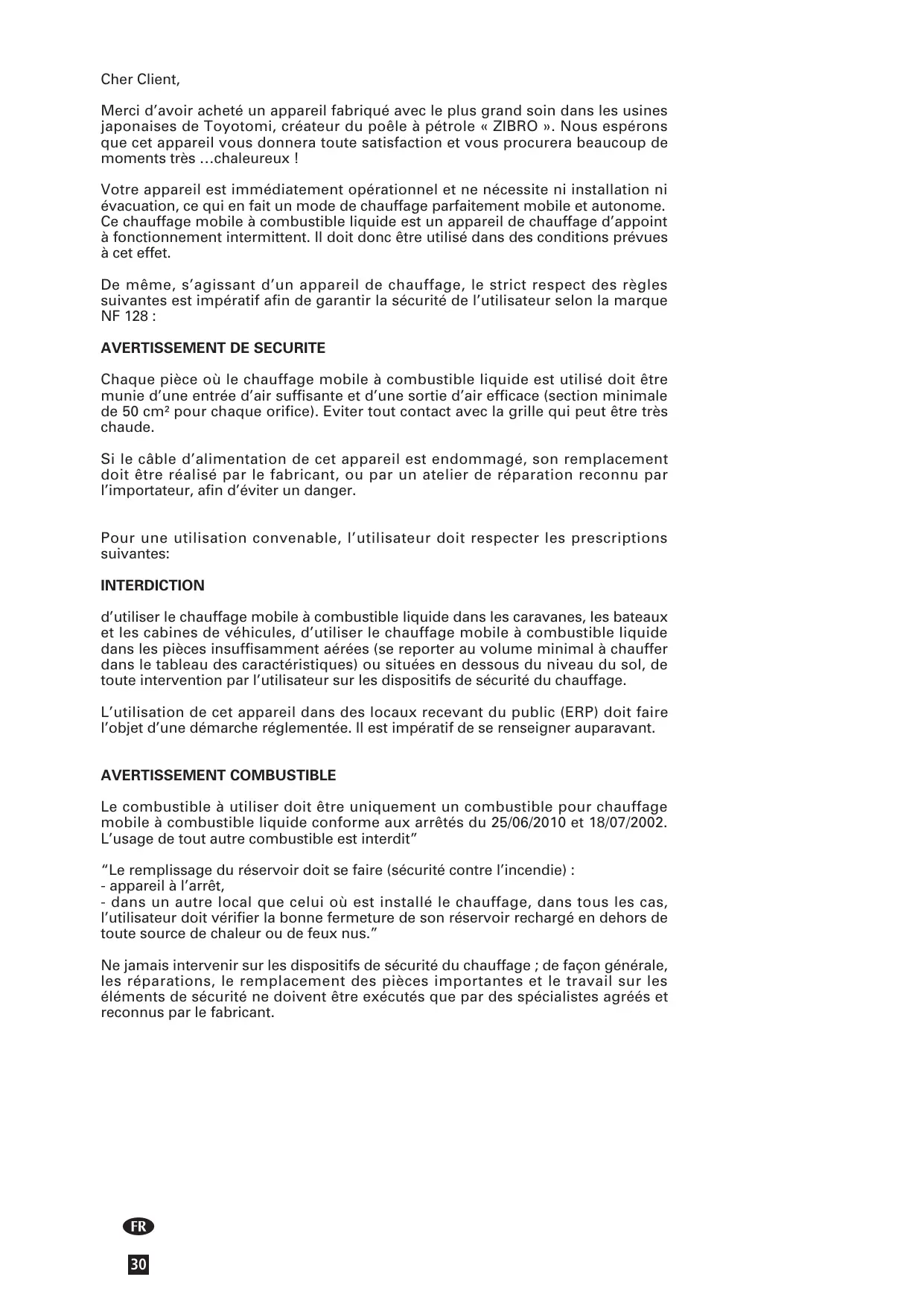 PARTICULIÈREMENT POUR LA FRANCE: Votre appareil de chauffage a été conçu pour fonctionner uniquement avec un combustible pour chauffage mobile à combustible liquide (conforme aux arrêtés du 18/7/2002 et du 25/6/2010). L’usage de tout autre combustible est interdit. Réclamez-les chez votre revendeur ou consultez notre site internet pour l’adresse de nos points de ventes.