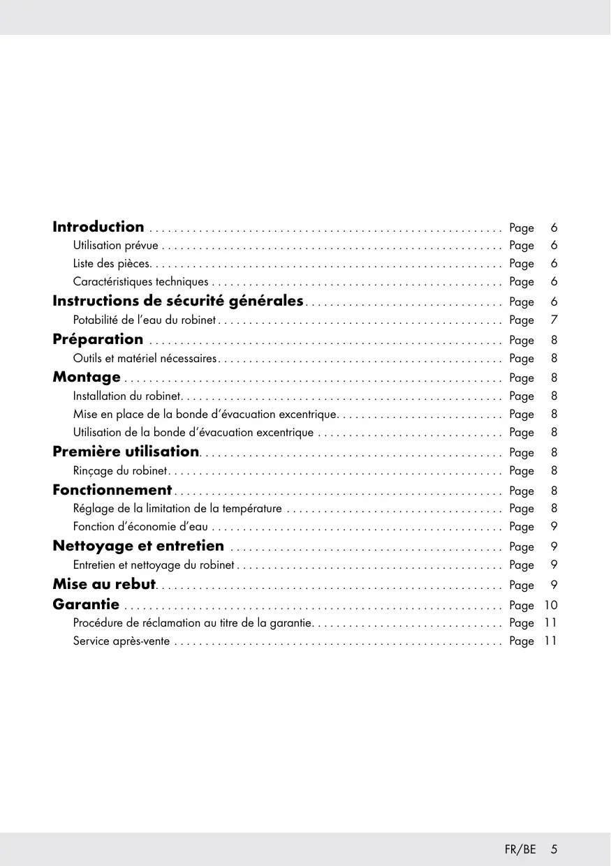 - s‘il présente les qualités qu‘un acheteur peut légitimement attendre eu égard aux déclarations publiques faites par le vendeur, par le producteur ou par son représentant, notamment dans la publicité ou l‘étiquetage ; 2° Ou s‘il présente les caractéristiques définies d‘un commun accord par les parties ou être propre à tout usage spécial recherché par l‘acheteur, porté à la connaissance du vendeur et que ce dernier a accepté. Article L217-12 du Code de la consommation L‘action résultant du défaut de conformité se prescrit par deux ans à compter de la délivrance du bien. Article 1641 du Code civil Le vendeur est tenu de la garantie à raison des défauts cachés de la chose vendue qui la rendent impropre à l‘usage auquel on la destine, ou qui diminuent tellement cet usage que l‘acheteur ne l‘aurait pas acquise, ou n‘en aurait donné qu‘un moindre prix, s‘il les avait connus. Article 1648 1er alinéa du Code civil L‘action résultant des vices rédhibitoires doit être intentée par l‘acquéreur dans un délai de deux ans à compter de la découverte du vice. Les pièces détachées indispensables à l’utilisation du produit sont disponibles pendant la durée de la garantie du produit. Le produit a été fabriqué selon des directives de qualité strictes, puis soigneusement examiné avant la livraison. En cas de défauts matériels ou de fabrication, vous avez des droits légaux vis-àvis du revendeur de ce produit. Vos droits légaux ne sont pas limités de quelque manière que ce soit par notre garantie détaillée ci-dessous. La garantie de ce produit est de 3 ans à compter de la date d’achat. La période de garantie commence à la date d’achat. Conservez l’original du reçu de vente en lieu sûr, car ce document est exigé comme preuve d’achat. Les dommages ou les défauts déjà présents lors de l’achat doivent être signalés sans délai après avoir déballé le produit. Si le produit présente un défaut matériel ou de fabrication dans un délai de 3 ans suivant la date d‘achat, nous le réparerons ou le remplacerons, à notre discrétion, sans frais supplémentaires pour vous. La période de garantie n’est pas étendue suite à l’acceptation d’une réclamation. Cela s’applique également aux pièces remplacées et réparées. Cette garantie est annulée si le produit a été endommagé ou utilisé/entretenu incorrectement. La garantie couvre les défauts matériels et de fabrication. Cette garantie ne couvre pas les pièces du produit soumises à une usure normale, considérées de ce fait comme des consommables (p. ex., piles, piles rechargeables, tubes, cartouches), ni les dommages occasionnés aux pièces fragiles, telles que les interrupteurs ou les éléments en verre. Procédure de réclamation au titre de la garantie Pour garantir un traitement rapide de votre réclamation, respectez les instructions suivantes : Assurez-vous de disposer de l’original du reçu de vente et du numéro d’article (IAN 416203_2210) comme preuve d’achat. Vous trouverez le numéro d’article sur la plaque signalétique, une gravure sur le produit, la première page du manuel d’utilisation (en bas à gauche) ou sous la forme d’une étiquette à l’arrière ou sur la partie inférieure du produit. Si un défaut fonctionnel ou autre survient, contactez le service client indiqué ci-dessous, par téléphone ou par e-mail. Une fois le produit enregistré comme défectueux, vous pourrez le retourner gratuitement à l’adresse du service qui vous a été communiquée. Assurez-vous de joindre la preuve d’achat (reçu de vente) et une courte description écrite indiquant les détails du défaut et quand il est survenu. Service après-vente Service après-vente France Tél.: 0800904879 E-Mail: owim@lidl.fr Service après-vente Belgique Tél.: 080071011 Tél.: 80023970 (Luxembourg) E-Mail: owim@lidl.be FR/BE 11 Inleiding . . . . . . . . . . . . . . . . . . . . . . . . . . . . . . . . . . . . . . . . . . . . . . . . . . . . . . . . . . . . Pagina 13 Beoogd gebruik . . . . . . . . . . . . . . . . . . . . . . . . . . . . . . . . . . . . . . . . . . . . . . . . . . . . . . Pagina 13 Onderdelenlijst . . . . . . . . . . . . . . . . . . . . . . . . . . . . . . . . . . . . . . . . . . . . . . . . . . . . . . . Pagina 13 Technische gegevens . . . . . . . . . . . . . . . . . . . . . . . . . . . . . . . . . . . . . . . . . . . . . . . . . . . Pagina 13 Algemene veiligheidsinstructies . . . . . . . . . . . . . . . . . . . . . . . . . . . . . . . . Pagina 13 Drinkbaarheid van leidingwater . . . . . . . . . . . . . . . . . . . . . . . . . . . . . . . . . . . . . . . . . . Pagina 14 Voorbereiding . . . . . . . . . . . . . . . . . . . . . . . . . . . . . . . . . . . . . . . . . . . . . . . . . . . . . Pagina 15 Benodigd gereedschap en materiaal . . . . . . . . . . . . . . . . . . . . . . . . . . . . . . . . . . . . . . Pagina 15 Installatie . . . . . . . . . . . . . . . . . . . . . . . . . . . . . . . . . . . . . . . . . . . . . . . . . . . . . . . . . . . Pagina 15 De kraan installeren . . . . . . . . . . . . . . . . . . . . . . . . . . . . . . . . . . . . . . . . . . . . . . . . . . . Pagina 15 De afvoergarnituur aanbrengen . . . . . . . . . . . . . . . . . . . . . . . . . . . . . . . . . . . . . . . . . . Pagina 15 De afvoergarnituur gebruiken . . . . . . . . . . . . . . . . . . . . . . . . . . . . . . . . . . . . . . . . . . . . Pagina 15 Eerste gebruik . . . . . . . . . . . . . . . . . . . . . . . . . . . . . . . . . . . . . . . . . . . . . . . . . . . . . Pagina 15 De kraan doorspoelen . . . . . . . . . . . . . . . . . . . . . . . . . . . . . . . . . . . . . . . . . . . . . . . . . Pagina 15 Bediening . . . . . . . . . . . . . . . . . . . . . . . . . . . . . . . . . . . . . . . . . . . . . . . . . . . . . . . . . . Pagina 15 Temperatuurbegrenzing instellen . . . . . . . . . . . . . . . . . . . . . . . . . . . . . . . . . . .