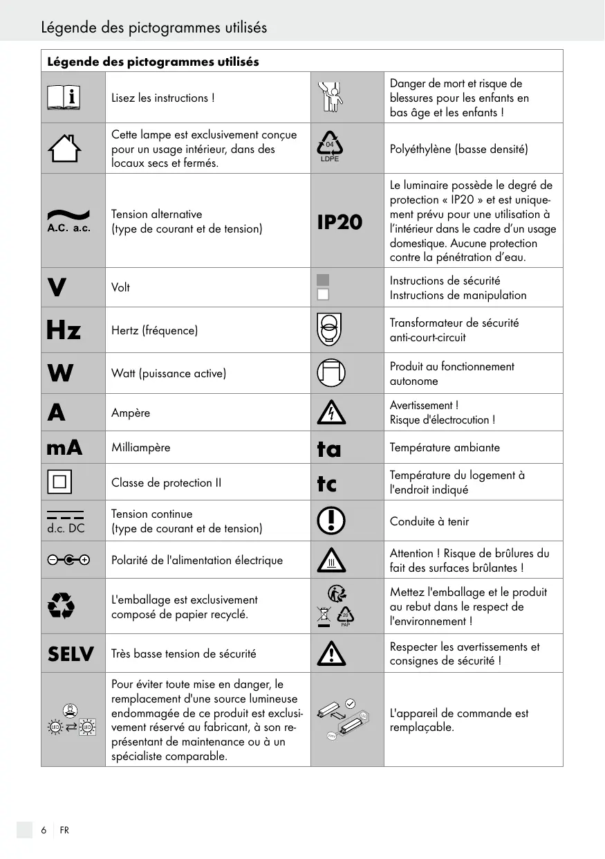 Légende des pictogrammes utilisés Légende des pictogrammes utilisés Danger de mort et risque de blessures pour les enfants en bas âge et les enfants ! Lisez les instructions ! Cette lampe est exclusivement conçue pour un usage intérieur, dans des locaux secs et fermés. Tension alternative (type de courant et de tension) Polyéthylène (basse densité) IP20 Instructions de sécurité Instructions de manipulation Hertz (fréquence) Transformateur de sécurité anti-court-circuit Watt (puissance active) Produit au fonctionnement autonome Ampère Avertissement ! Risque d'électrocution ! Classe de protection II