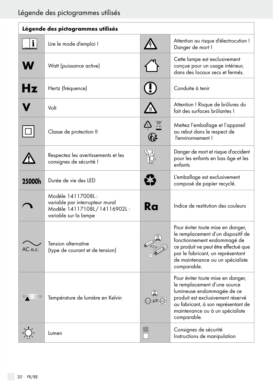 Caractéristiques techniques Lampe: Numéro de modèle : 14117008L / 14117108L / 14116902L Tension de fonctionnement : 230–240 V~, 50 Hz Puissance nominale : 14116902L / 14117008L : 18,5 W 14117108L : 20 W Classe de protection : II / Module LED : Ampoule : LED Puissance nominale : 14116902L : 16,9 W 14117008L : 16,8 W (4 x 4,2 W) 14117108L : 19,2 W (4 x 4,8 W) Ce produit contient des sources lumineuses de classe d’efficacité énergétique « F ».