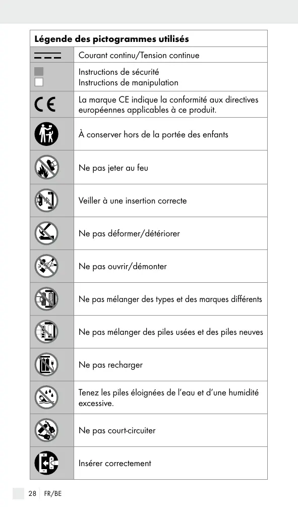 Légende des pictogrammes utilisés Courant continu/Tension continue Instructions de sécurité Instructions de manipulation La marque CE indique la conformité aux directives européennes applicables à ce produit. À conserver hors de la portée des enfants Ne pas jeter au feu Veiller à une insertion correcte Ne pas déformer/détériorer Ne pas ouvrir/démonter Ne pas mélanger des types et des marques différents Ne pas mélanger des piles usées et des piles neuves Ne pas recharger Tenez les piles éloignées de l’eau et d’une humidité excessive. Ne pas court-circuiter Insérer correctement