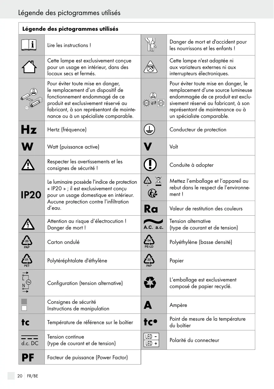 Le luminaire possède l’indice de protection « IP20 » ; il est exclusivement conçu pour un usage domestique en intérieur. Aucune protection contre l’infiltration d’eau.