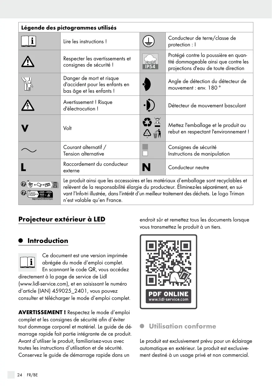 Courant alternatif / Tension alternative Consignes de sécurité Instructions de manipulation Raccordement du conducteur externe Conducteur neutre Le produit ainsi que les accessoires et les matériaux d’emballage sont recyclables et relèvent de la responsabilité élargie du producteur. Éliminez-les séparément, en suivant l’Info-tri illustrée, dans l’intérêt d’un meilleur traitement des déchets. Le logo Triman n’est valable qu’en France. Projecteur extérieur à LED endroit sûr et remettez tous les documents lorsque vous transmettez le produit à un tiers. Introduction Ce document est une version imprimée abrégée du mode d‘emploi complet. En scannant le code QR, vous accédez directement à la page de service de Lidl (www.lidl-service.com), et en saisissant le numéro d‘article (IAN) 459025_2401, vous pouvez consulter et télécharger le mode d‘emploi complet. AVERTISSEMENT ! Respectez le mode d‘emploi complet et les consignes de sécurité afin d‘éviter tout dommage corporel et matériel. Le guide de démarrage rapide fait partie intégrante de ce produit. Avant d‘utiliser le produit, familiarisez-vous avec toutes les instructions d‘utilisation et de sécurité. Conservez le guide de démarrage rapide dans un