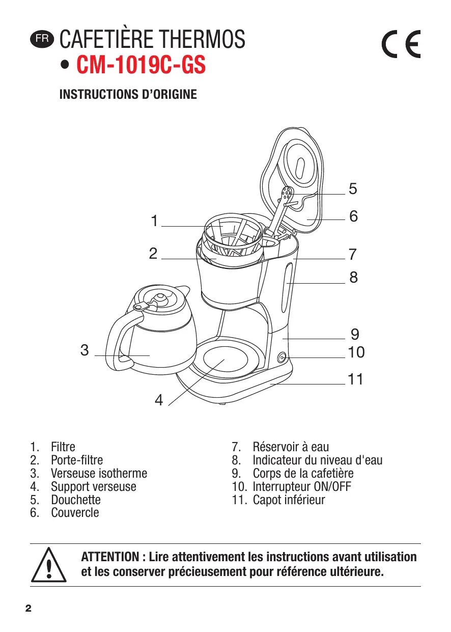 1. Lisez toutes les instructions. 2. Assurez-vous que la tension de sortie correspond à la tension indiquée sur l’étiquette signalétique de la cafetière. 3. N’utilisez pas d’appareil avec un cordon ou une fiche endommagés, ou dans un état anormal. 4. Ne touchez pas les surfaces chaudes. Utilisez les poignées ou les boutons. 5. Pour se protéger contre les incendies, les chocs électriques et les blessures corporelles, ne pas immerger le cordon, la prise dans de l’eau ou tout autre liquide. 6. Débranchez la cafetière avant le nettoyage et lorsqu’elle n’est pas utilisée. Laissez refroidir complètement l’appareil avant de le désassembler ou avant de le nettoyer. 7. L’utilisation d’accessoires n’est pas recommandée par le fabricant de l’appareil. Cela peut entraîner un incendie, un choc électrique et/ou une blessure corporelle. 8. La verseuse isotherme est conçue pour être utilisée avec cet appareil. Elle ne peut pas être utilisée sur une plaque de cuisson. 9. Ne nettoyez pas la verseuse isotherme avec des nettoyants, des éponges métalliques ou d’autres matériaux abrasifs. 10. Ne laissez pas pendre le cordon d’alimentation sur le bord de la table ou du plan de travail. Ne le laissez pas non plus toucher une surface chaude. 11. Ne pas placer la cafetière sur une surface chaude ou à côté d’un feu afin d’éviter de l’endommager. 12. Pour débrancher, retirez la fiche de la prise murale. Tenez toujours la fiche. Mais ne tirez jamais sur le cordon. 13. Ne pas utiliser l’appareil pour un usage autre que celui pour lequel il est prévu et le placer dans un environnement sec. 4