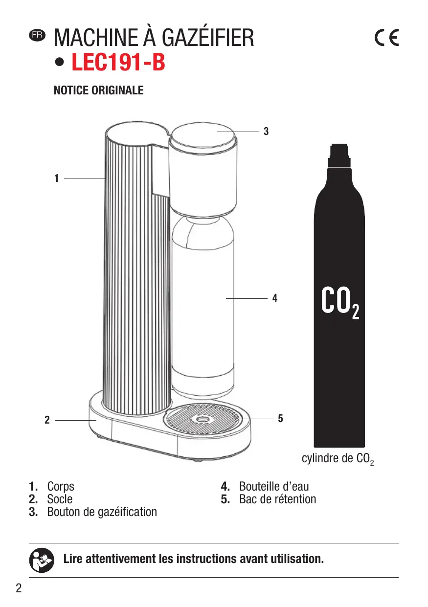 Félicitations pour l’achat de votre machine à gazéifier. Quelques minutes consacrées à la lecture de ce manuel vous permettront de profiter de tout le potentiel de cette excellente machine à soda. Gazéifier de l’eau chez soi est une solution à la fois pratique, abordable et écologique. Autre avantage de la machine à soda par rapport à l’eau minérale en bouteille : vous décidez vous-même du niveau de gazéification qui vous convient. Vous êtes sur le point de faire connaissance avec votre machine à soda et de découvrir son fonctionnement pour obtenir le niveau de gazéification idéal. Peut-être appréciez-vous une gazéification intense, ou au contraire un pétillant plus doux. La machine à eau gazeuse est conçue et testée pour obtenir le meilleur degré de qualité et de sécurité qui soit. Pour autant, les produits gazeux ou à haute pression doivent systématiquement être manipulés avec précaution. Par conséquent, il est important de respecter les usages prévus de ce produit. Veuillez lire intégralement et attentivement la rubrique de ce manuel consacrée à la sécurité avant d’utiliser le produit. AVERTISSEMENTS CONCERNANT L’APPAREIL ET SON UTILISATION
