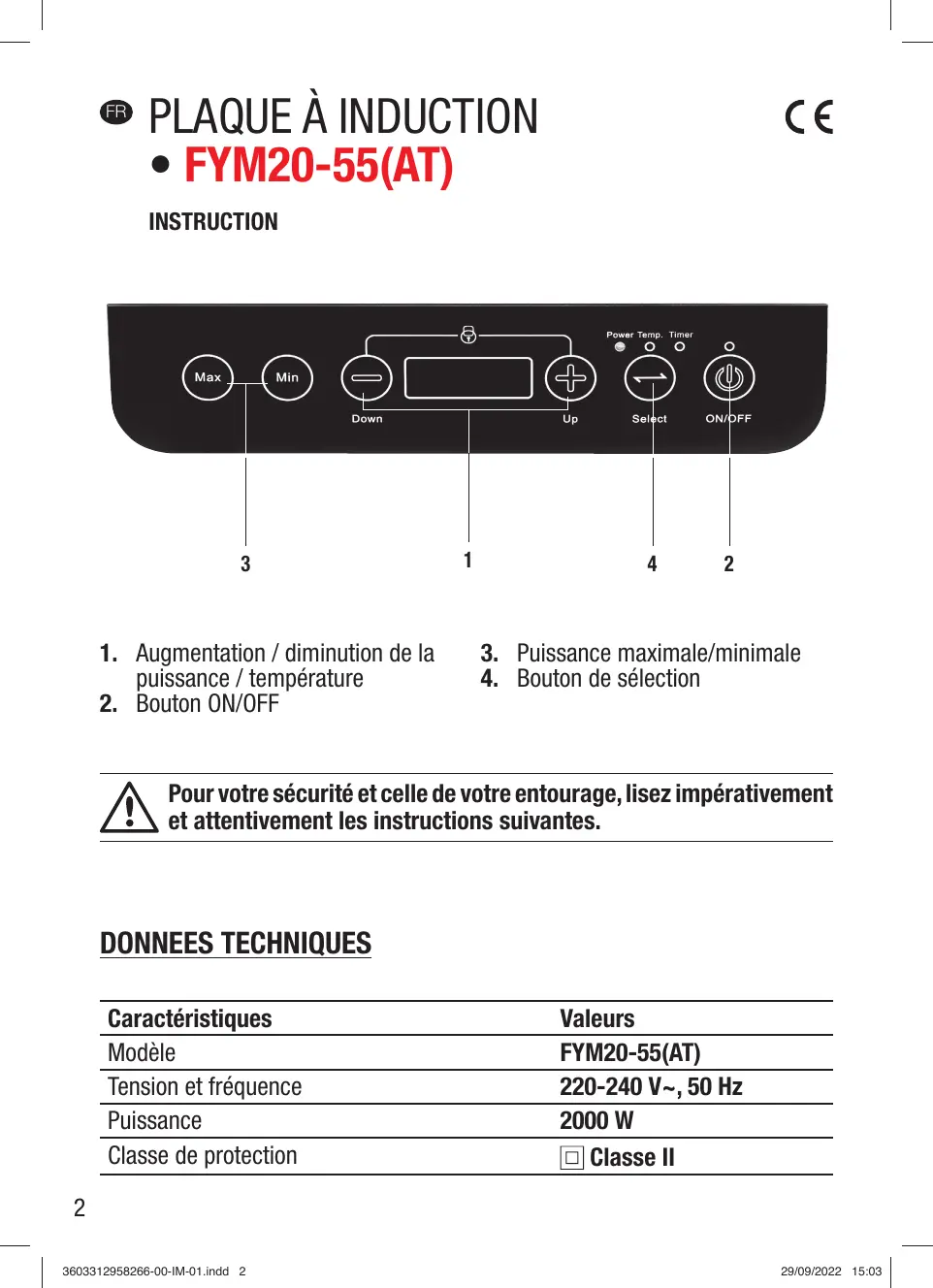 Pour votre sécurité et celle de votre entourage, lisez impérativement et attentivement les instructions suivantes. DONNEES TECHNIQUES Caractéristiques Modèle Tension et fréquence Puissance Classe de protection Valeurs FYM20-55(AT) 220-240 V~, 50 Hz 2000 W Classe II