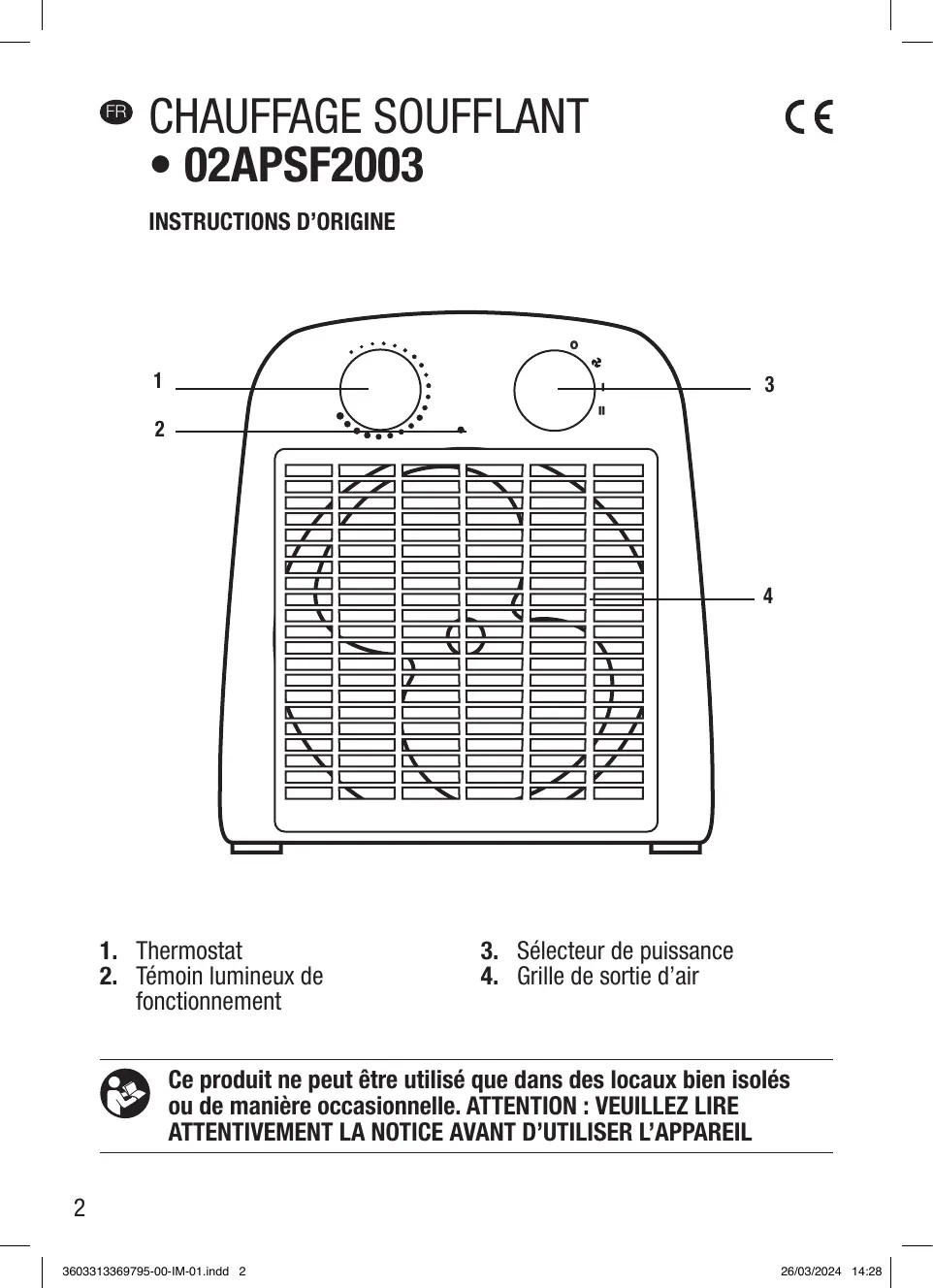 Ce produit ne peut être utilisé que dans des locaux bien isolés ou de manière occasionnelle. ATTENTION : VEUILLEZ LIRE ATTENTIVEMENT LA NOTICE AVANT D'UTILISER L'APPAREIL
