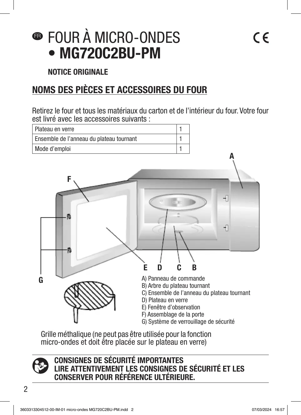 LIRE ATTENTIVEMENT LES CONSIGNES DE SÉCURITÉ ET LES CONSERVER POUR RÉFÉRENCE ULTÉRIEURE. 3603313304512-00-IM-01 micro-ondes MG720C2BU-PM.indd 2 07/03/2024 16:57 Lisez attentivement ces instructions avant d’utiliser votre four à microondes et conservez-les soigneusement. Si vous suivez les instructions, votre four vous offrira de nombreuses années de bon service.