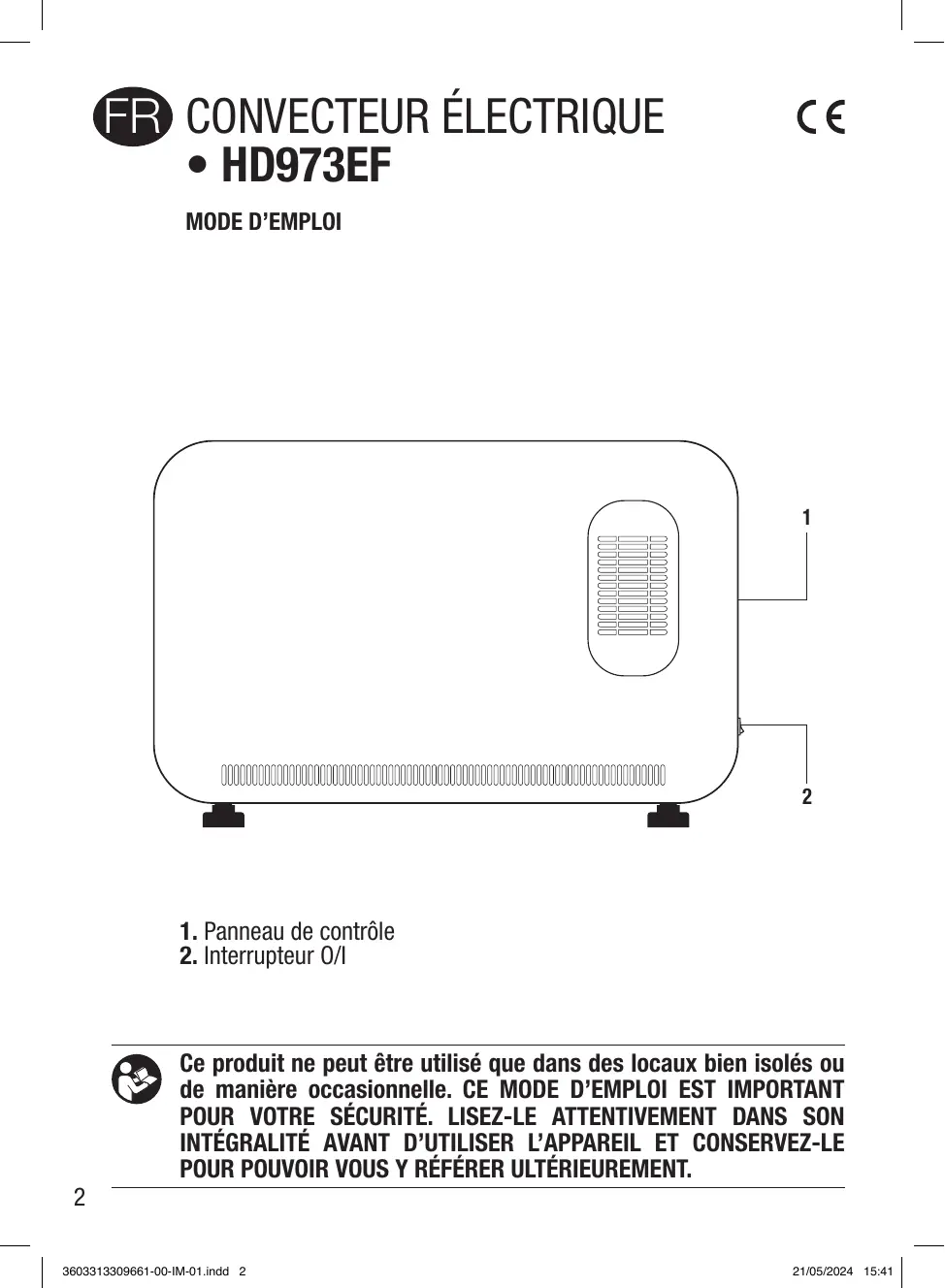 Ce produit ne peut être utilisé que dans des locaux bien isolés ou de manière occasionnelle. CE MODE D'EMPLOI EST IMPORTANT POUR VOTRE SECURITE. LIZEZ-LE ATTENTIVEMENT DANS SON INTÉGRALITE AVANT D'UTILISER L'APPAREIL ET CONSERVEZ-LE POUR POUVOIR VOUS Y RÉFÉRER ULTÉIREULEMENT.