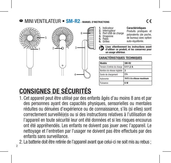 5. Lorsque la batterie est faible, la puissance du vent diminue et l’appareil s’éteint automatiquement après épuisement de la batterie 6. Cet appareil utilise une batterie au lithium-ion, vous n’avez pas à attendre que la batterie soit épuisée pour la recharger, charger régulièrement la batterie permet de prolonger sa durée de vie. 7. Lorsque le ventilateur fonctionne, les pales du ventilateur tournent très rapidement. Il est interdit d’insérer des objets à l’intérieur de l’appareil pour ne pas l’endommager. 8. Si vous n’utilisez pas le ventilateur pendant une longue période, vous devez recharger la batterie, la sceller dans un sac en plastique et la stocker dans un endroit sec et frais. 9. La durée de vie de la batterie sera considérablement réduite si : - la batterie est utilisée dans une température ambiante supérieure à 60°C, - la batterie est comprimée et fissurée, Ces risques peuvent également engendrer un risque de fuite ou d’explosion. 10. La batterie de l’appareil ne doit être remplacée que par une personne qualifiée. 11. L’appareil doit être alimenté uniquement sous la très basse tension de sécurité correspondant au marquage de l’appareil. 3