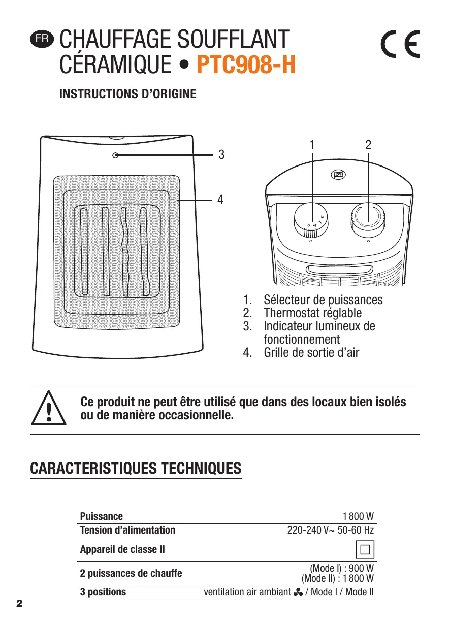 | Caractéristiques techniques principales | Technologie PTC (Positive Temperature Coefficient) pour un chauffage rapide et efficace. |