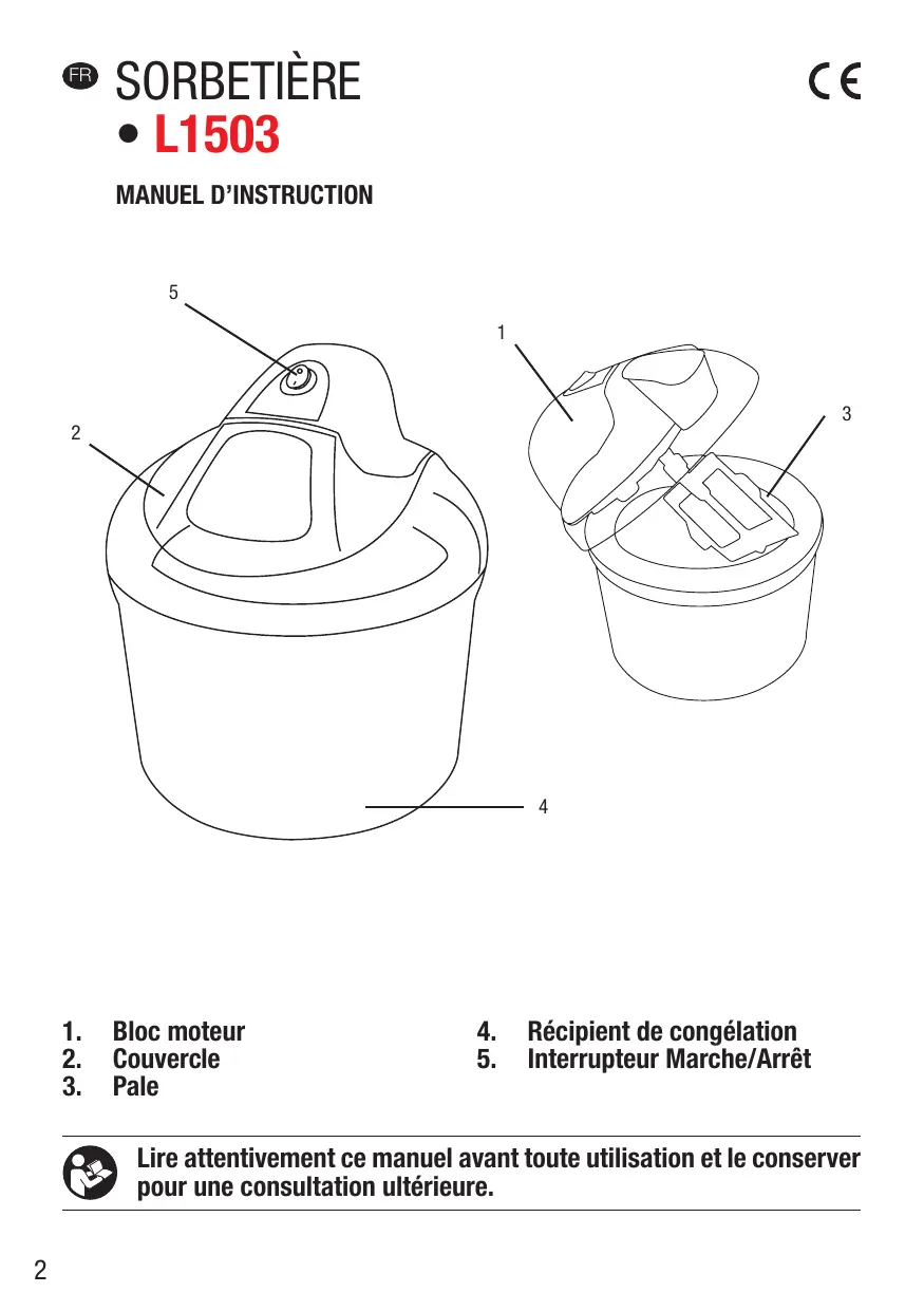 • Si la solution de congélation fuit du récipient, ne l’utilisez plus. La solution de congélation n’est pas toxique. • Ne placez pas la machine sur des surfaces chaudes telles que des cuisinières, des plaques chauffantes ou à proximité de flammes nues. • Mettre l’appareil à l’arrêt et le déconnecter de l’alimentation avant de changer les accessoires ou d’approcher les parties qui sont mobiles lors du fonctionnement. • Toujours déconnecter l’appareil de l’alimentation si on le laisse sans surveillance et avant montage, démontage ou nettoyage. • Cet appareil peut être utilisé par des enfants âgés d’au moins 8 ans, à condition qu’ils bénéficient d’une surveillance ou qu’ils aient reçu des instructions quant à l’utilisation de l’appareil en toute sécurité et qu’ils comprennent bien les dangers encourus. Le nettoyage et l’entretien de l’utilisateur ne doivent pas être effectués par des enfants, à moins qu’ils ne soient âgés d’au moins 8 ans et qu’ils soient sous la surveillance d’un adulte. Conserver l’appareil et son câble hors de portée des enfants âgés de moins de 8 ans. • Cet appareil peut être utilisé par des personnes dont les capacités physiques, sensorielles ou mentales sont réduites ou dont l’expérience ou les connaissances ne sont pas suffisantes, à condition qu’ils bénéficient d’une surveillance ou qu’ils aient reçu des instructions quant à l’utilisation de l’appareil en toute sécurité et dans la mesure où ils en comprennent bien les dangers potentiels. Les enfants ne doivent pas utiliser l’appareil comme un jouet. • Il y a des risques de blessures en cas de mauvaise utilisation. Des précautions doivent être prises lors de la manipulation de la pale, lorsqu’on vide le récipient et lors du nettoyage. • Cet appareil est destiné à être utilisé dans des applications domestiques et analogues telles que : - des coins cuisines réservés au personnel dans des magasins, bureaux et autres environnements professionnels; - des fermes; - l’utilisation par les clients des hôtels, motels et autres environnements à caractère résidentiel; - des environnements du type chambres d’hôtes. • En ce qui concerne les durées de fonctionnement maximales, référez-vous au paragraphe ci-après de la notice. • En ce qui concerne les informations détaillées sur la manière de nettoyer les surfaces en contact avec les aliments, référez-vous au paragraphe ci-après de la notice. 4
