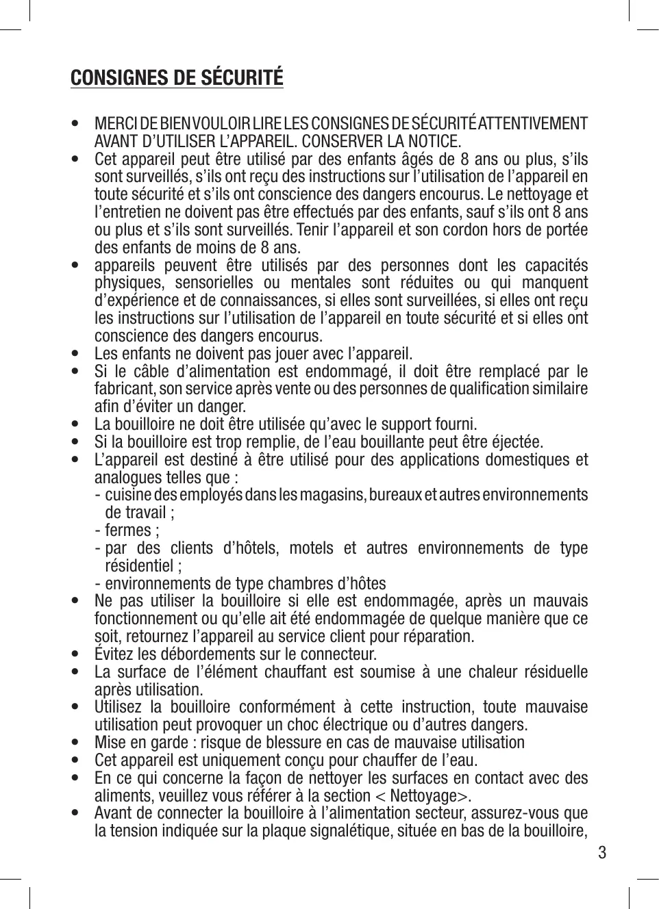 • appareils peuvent être utilisés par des personnes dont les capacités physiques, sensorielles ou mentales sont réduites ou qui manquent d’expérience et de connaissances, si elles sont surveillées, si elles ont reçu les instructions sur l’utilisation de l’appareil en toute sécurité et si elles ont conscience des dangers encourus. • Les enfants ne doivent pas jouer avec l’appareil. • Si le câble d’alimentation est endommagé, il doit être remplacé par le fabricant, son service après vente ou des personnes de qualification similaire afin d’éviter un danger. • La bouilloire ne doit être utilisée qu’avec le support fourni. • Si la bouilloire est trop remplie, de l’eau bouillante peut être éjectée. • L’appareil est destiné à être utilisé pour des applications domestiques et analogues telles que : - cuisine des employés dans les magasins, bureaux et autres environnements de travail ; - fermes ; - par des clients d’hôtels, motels et autres environnements de type résidentiel ; - environnements de type chambres d’hôtes • Ne pas utiliser la bouilloire si elle est endommagée, après un mauvais fonctionnement ou qu’elle ait été endommagée de quelque manière que ce soit, retournez l’appareil au service client pour réparation. • Évitez les débordements sur le connecteur. • La surface de l’élément chauffant est soumise à une chaleur résiduelle après utilisation. • Utilisez la bouilloire conformément à cette instruction, toute mauvaise utilisation peut provoquer un choc électrique ou d’autres dangers. • Mise en garde : risque de blessure en cas de mauvaise utilisation • Cet appareil est uniquement conçu pour chauffer de l’eau. • En ce qui concerne la façon de nettoyer les surfaces en contact avec des aliments, veuillez vous référer à la section < Nettoyage>. • Avant de connecter la bouilloire à l’alimentation secteur, assurez-vous que la tension indiquée sur la plaque signalétique, située en bas de la bouilloire, 3