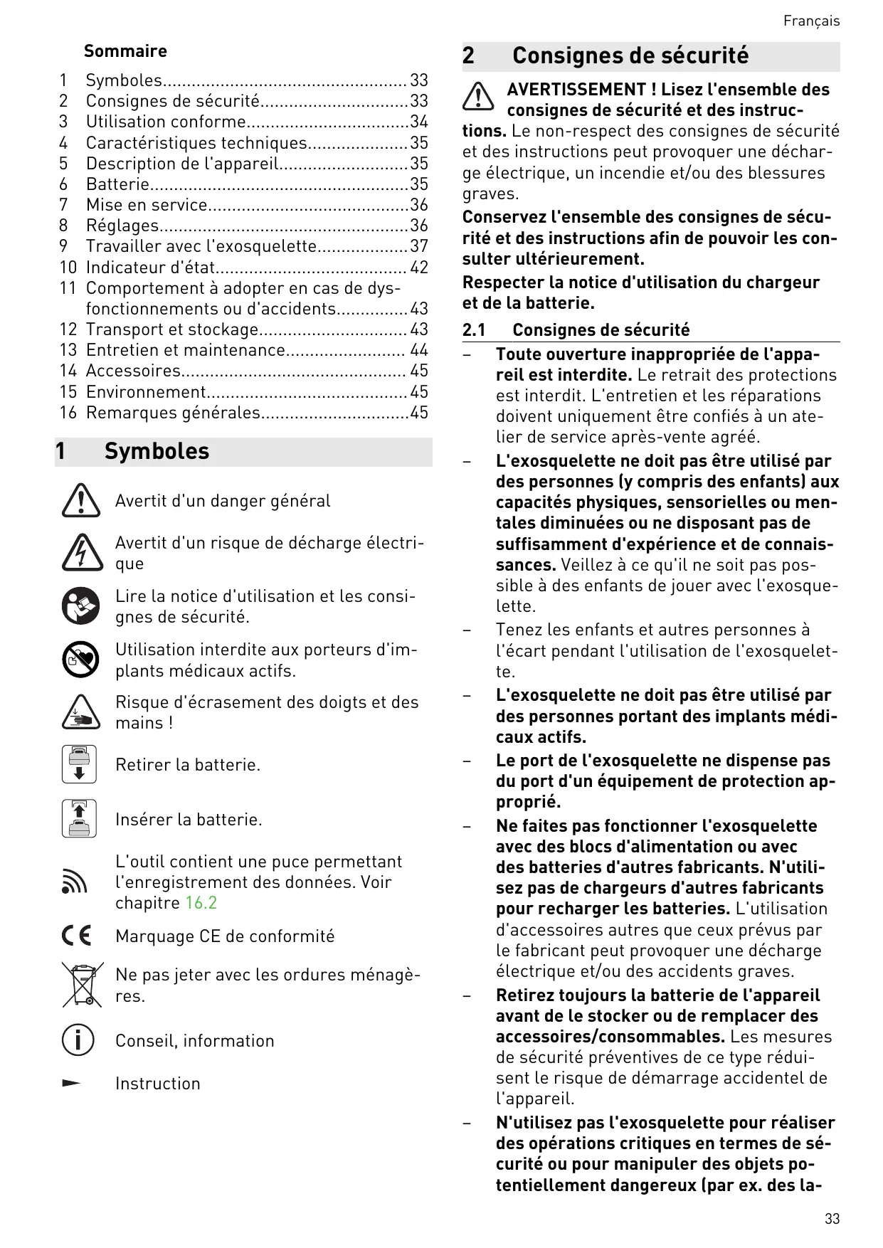 EN 301 489-17 V3.2.4 BS EN 62233:2008 BS EN 62479:2010 BS EN IEC 62368-1:2020 + A11:2020 BS EN IEC 63000:2018 The conformity assessment procedure as referenced in Article 17 and detailed in Annex III of the Radio Equipment Regulation S.I. 2017/1206 has been followed with the involvement of Notified EN 62479:2010, EN IEC 62368-1:2020 + A11:2020, EN IEC 63000:2018 Das Konformitätsbewertungsverfahren, auf das in Artikel 17 verwiesen und im Anhang III der Funkanlagenrichtlinie 2014/53/EU detailliert wird, wurde unter Einbeziehung der benannten Stelle durchgeführt: Entretien et maintenance 44 Accessoires 45 Environnement 45 Remarques générales45 Respecter la notice d'utilisation du chargeur et de la batterie. 2.1 Consignes de sécurité – Toute ouverture inappropriée de l'appa reil est interdite. Le retrait des protections est interdit. L'entretien et les réparations doivent uniquement être confiés à un ate lier de service après-vente agréé. – L'exosquelette ne doit pas être utilisé par des personnes (y compris des enfants) aux capacités physiques, sensorielles ou men tales diminuées ou ne disposant pas de suffisamment d'expérience et de connais sances. Veillez à ce qu'il ne soit pas pos sible à des enfants de jouer avec l'exosque lette. – Tenez les enfants et autres personnes à l'écart pendant l'utilisation de l'exosquelet te. – L'exosquelette ne doit pas être utilisé par des personnes portant des implants médi caux actifs. – Le port de l'exosquelette ne dispense pas du port d'un équipement de protection ap proprié. – Ne faites pas fonctionner l'exosquelette avec des blocs d'alimentation ou avec des batteries d'autres fabricants. N'utili sez pas de chargeurs d'autres fabricants pour recharger les batteries. L'utilisation d'accessoires autres que ceux prévus par le fabricant peut provoquer une décharge électrique et/ou des accidents graves. – Retirez toujours la batterie de l'appareil avant de le stocker ou de remplacer des accessoires/consommables. Les mesures de sécurité préventives de ce type rédui sent le risque de démarrage accidentel de l'appareil. – N'utilisez pas l'exosquelette pour réaliser des opérations critiques en termes de sé curité ou pour manipuler des objets po tentiellement dangereux (par ex. des la