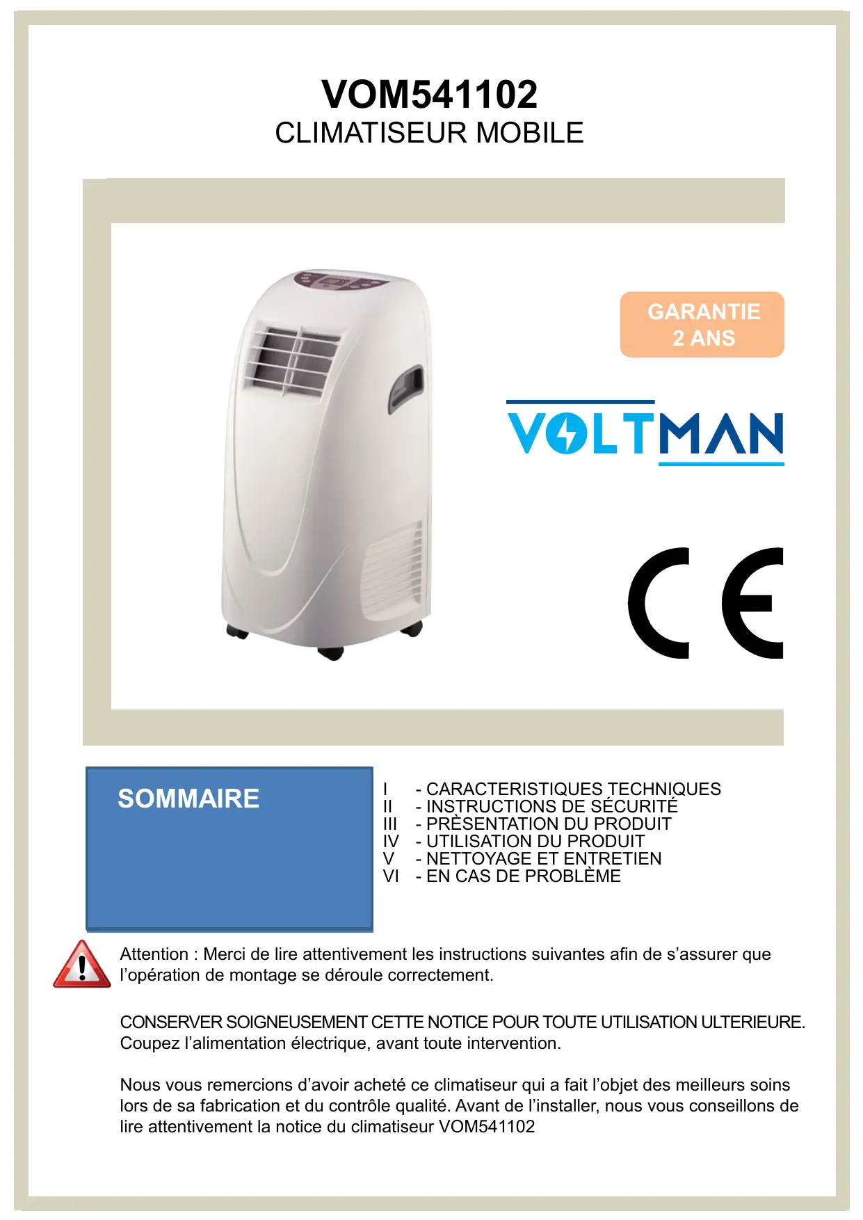 Attention : Merci de lire attentivement les instructions suivantes afin de s’assurer que l’opération de montage se déroule correctement. CONSERVER SOIGNEUSEMENT CETTE NOTICE POUR TOUTE UTILISATION ULTERIEURE. Coupez l’alimentation électrique, avant toute intervention. Nous vous remercions d’avoir acheté ce climatiseur qui a fait l’objet des meilleurs soins lors de sa fabrication et du contrôle qualité. Avant de l’installer, nous vous conseillons de lire attentivement la notice du climatiseur VOM541102
