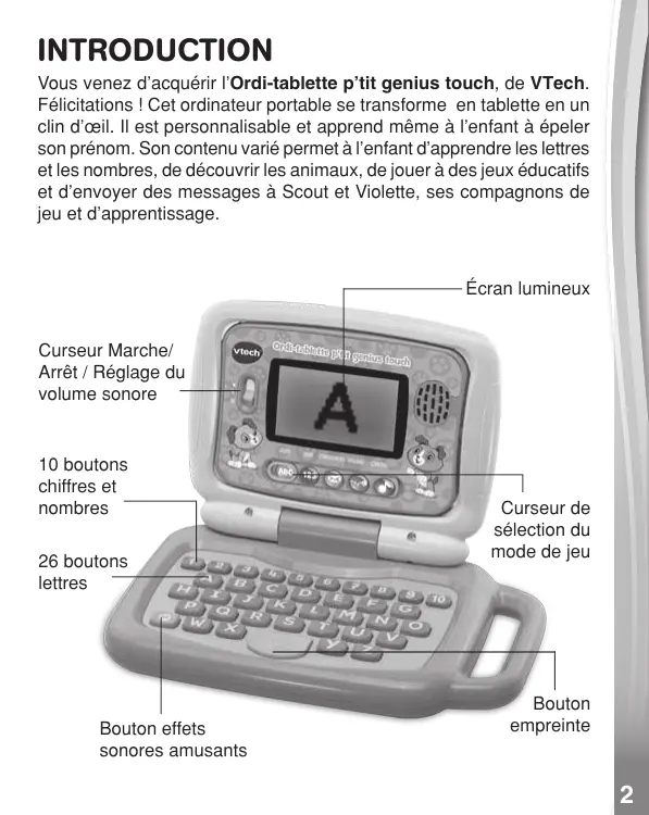 INTRODUCTION Vous venez d’acquérir l’Ordi-tablette p’tit genius touch, de VTech. Félicitations ! Cet ordinateur portable se transforme en tablette en un clin d’œil. Il est personnalisable et apprend même à l’enfant à épeler son prénom. Son contenu varié permet à l’enfant d’apprendre les lettres et les nombres, de découvrir les animaux, de jouer à des jeux éducatifs et d’envoyer des messages à Scout et Violette, ses compagnons de jeu et d’apprentissage. Écran lumineux Curseur Marche/ Arrêt / Réglage du volume sonore 10 boutons chiffres et nombres 26 boutons lettres Bouton effets sonores amusants Curseur de sélection du mode de jeu Bouton empreinte