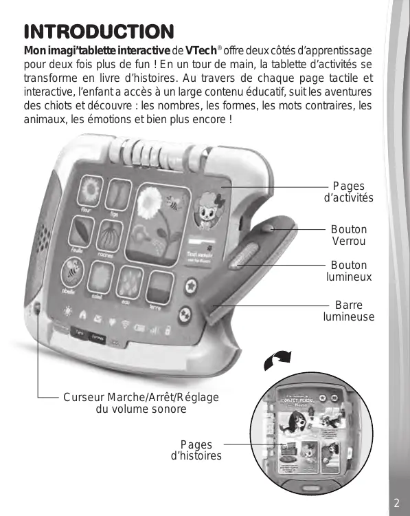 INTRODUCTION Mon imagi’tablette interactive de VTech® offre deux côtés d’apprentissage pour deux fois plus de fun ! En un tour de main, la tablette d’activités se transforme en livre d’histoires. Au travers de chaque page tactile et interactive, l’enfant a accès à un large contenu éducatif, suit les aventures des chiots et découvre : les nombres, les formes, les mots contraires, les animaux, les émotions et bien plus encore ! Pages d’activités Bouton Verrou Bouton lumineux Barre lumineuse Curseur Marche/Arrêt/Réglage du volume sonore Pages d’histoires