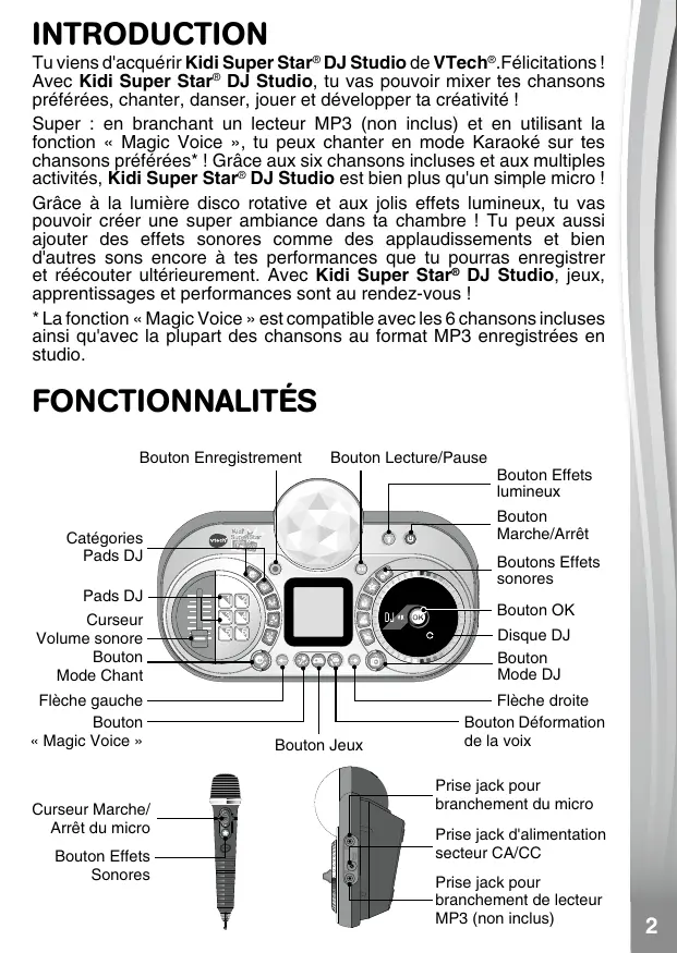 Manuel d'utilisation 91-003813-003 FR INTRODUCTION Tu viens d'acquérir Kidi Super Star® DJ Studio de VTech®.Félicitations ! Avec Kidi Super Star® DJ Studio, tu vas pouvoir mixer tes chansons préférées, chanter, danser, jouer et développer ta créativité ! Super : en branchant un lecteur MP3 (non inclus) et en utilisant la fonction « Magic Voice », tu peux chanter en mode Karaoké sur tes chansons préférées* ! Grâce aux six chansons incluses et aux multiples activités, Kidi Super Star® DJ Studio est bien plus qu'un simple micro ! Grâce à la lumière disco rotative et aux jolis effets lumineux, tu vas pouvoir créer une super ambiance dans ta chambre ! Tu peux aussi ajouter des effets sonores comme des applaudissements et bien d'autres sons encore à tes performances que tu pourras enregistrer et réécouter ultérieurement. Avec Kidi Super Star® DJ Studio, jeux, apprentissages et performances sont au rendez-vous !