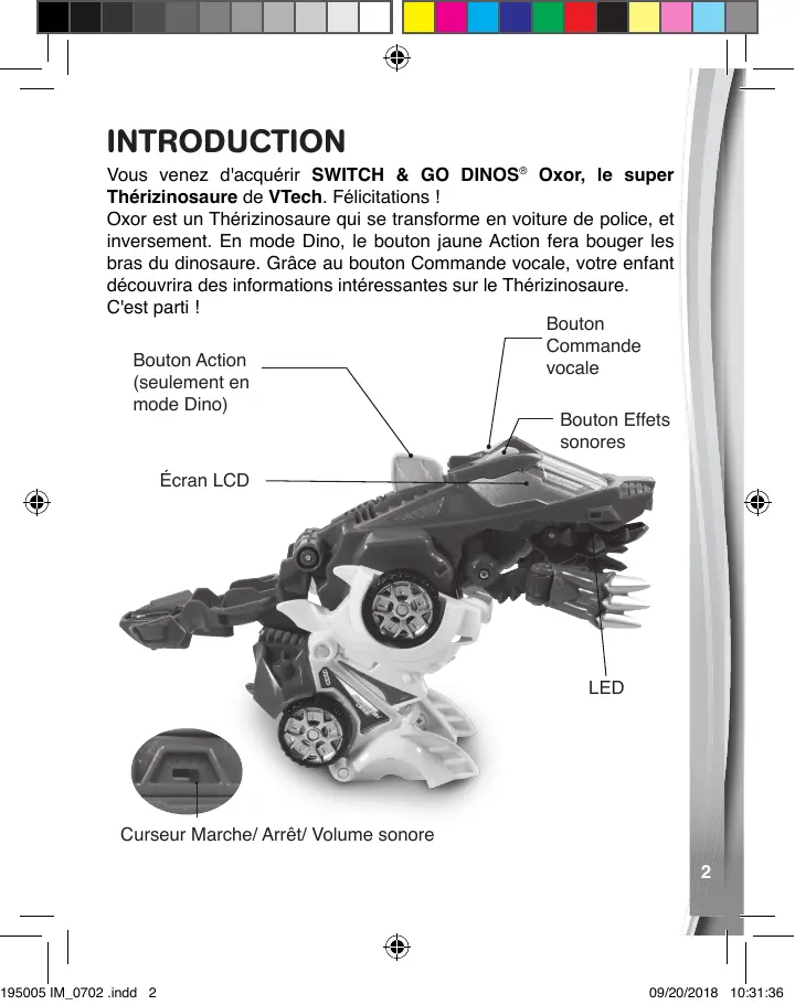 91-003395-004 FR 09/20/2018 10:31:35 INTRODUCTION Vous venez d'acquérir SWITCH & GO DINOS® Oxor, le super Thérizinosaure de VTech. Félicitations ! Oxor est un Thérizinosaure qui se transforme en voiture de police, et inversement. En mode Dino, le bouton jaune Action fera bouger les bras du dinosaure. Grâce au bouton Commande vocale, votre enfant découvrira des informations intéressantes sur le Thérizinosaure. C'est parti ! Bouton Commande Bouton Action vocale (seulement en mode Dino) Bouton Effets sonores Écran LCD LED Curseur Marche/ Arrêt/ Volume sonore 195005 IM_0702 .indd 2