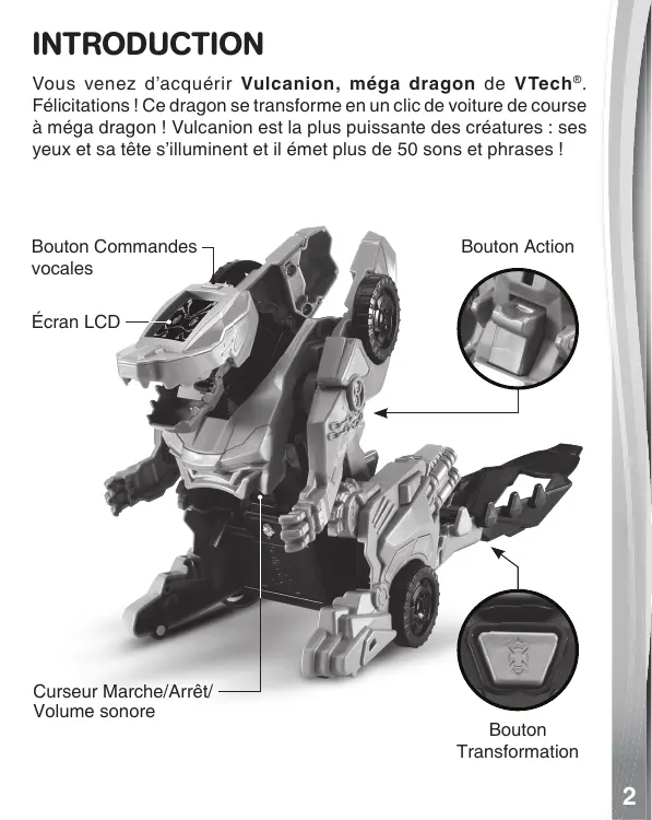 INTRODUCTION Vous venez d’acquérir Vulcanion, méga dragon de VTech ®. Félicitations ! Ce dragon se transforme en un clic de voiture de course à méga dragon ! Vulcanion est la plus puissante des créatures : ses yeux et sa tête s’illuminent et il émet plus de 50 sons et phrases ! Bouton Commandes vocales Bouton Action Écran LCD Curseur Marche/Arrêt/ Volume sonore Bouton Transformation