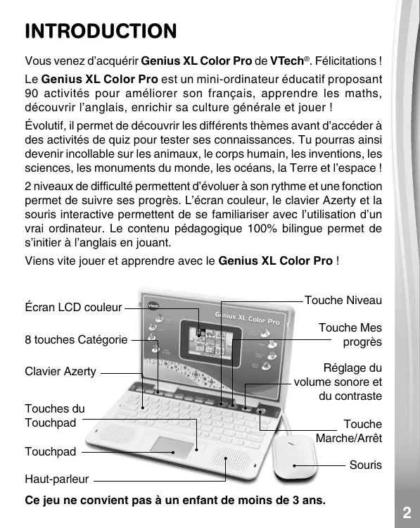 INTRODUCTION Vous venez d’acquérir Genius XL Color Pro de VTech®. Félicitations ! Le Genius XL Color Pro est un mini-ordinateur éducatif proposant 90 activités pour améliorer son français, apprendre les maths, découvrir l’anglais, enrichir sa culture générale et jouer ! Évolutif, il permet de découvrir les différents thèmes avant d’accéder à des activités de quiz pour tester ses connaissances. Tu pourras ainsi devenir incollable sur les animaux, le corps humain, les inventions, les sciences, les monuments du monde, les océans, la Terre et l’espace ! 2 niveaux de difficulté permettent d’évoluer à son rythme et une fonction permet de suivre ses progrès. L’écran couleur, le clavier Azerty et la souris interactive permettent de se familiariser avec l’utilisation d’un vrai ordinateur. Le contenu pédagogique 100% bilingue permet de s’initier à l’anglais en jouant. Viens vite jouer et apprendre avec le Genius XL Color Pro ! Écran LCD couleur 8 touches Catégorie Clavier Azerty Touches du Touchpad Touchpad Touche Niveau Touche Mes progrès Réglage du volume sonore et du contraste Touche Marche/Arrêt Souris Haut-parleur Ce jeu ne convient pas à un enfant de moins de 3 ans.